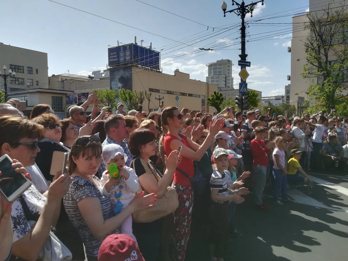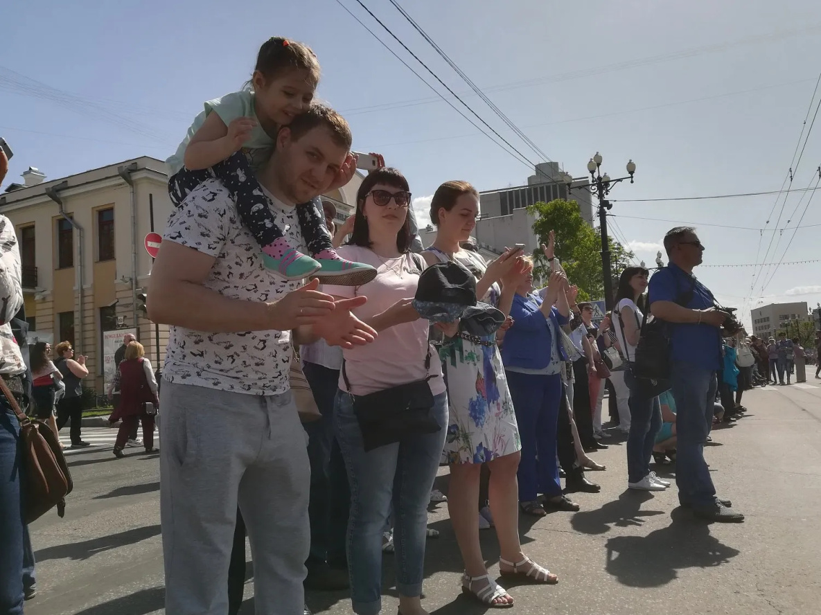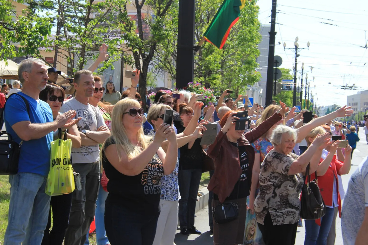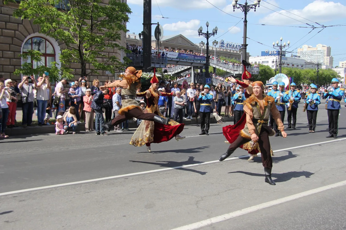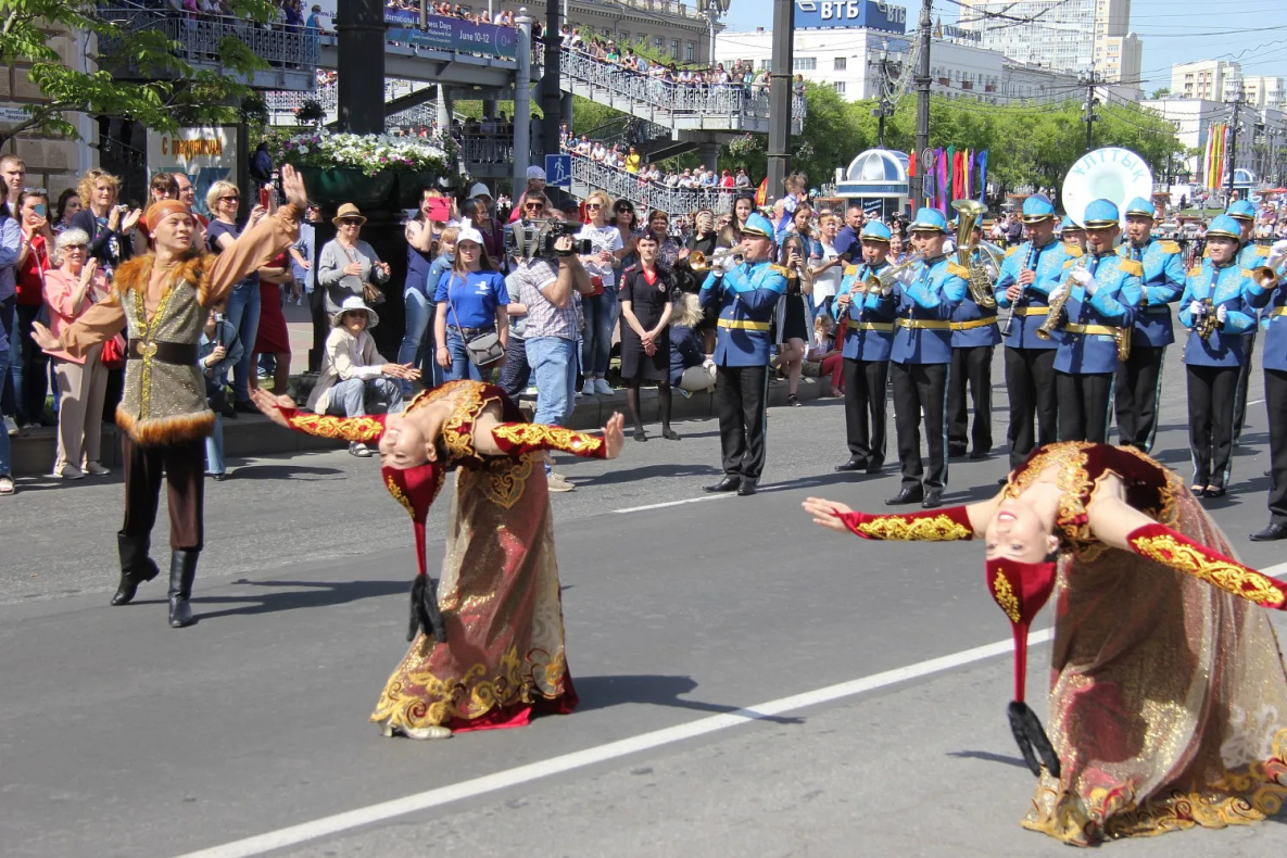 Ансамбль из Казахстана к высоким температурам, видимо, более привычен. Своё выступление гости из Центральной Азии украсили танцами в национальных костюмах, которые публике демонстрировали артисты по мере движения музыкальной колонны к Комсомольской площади.