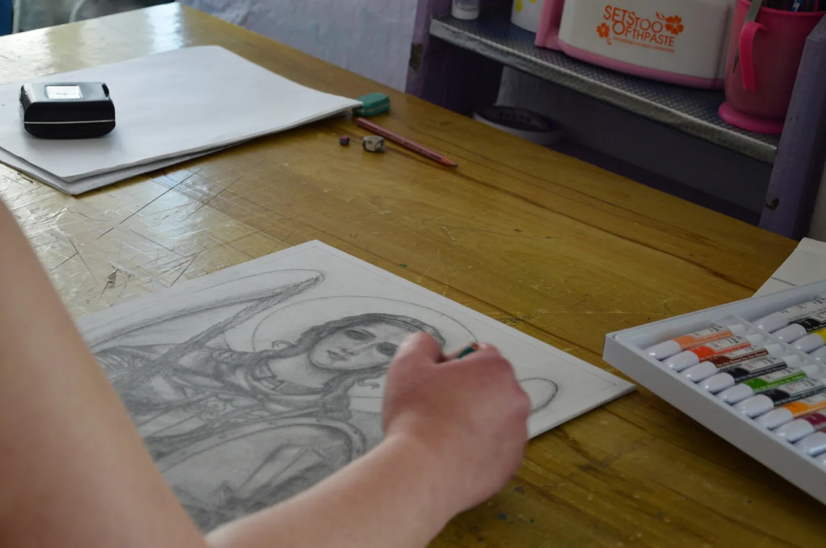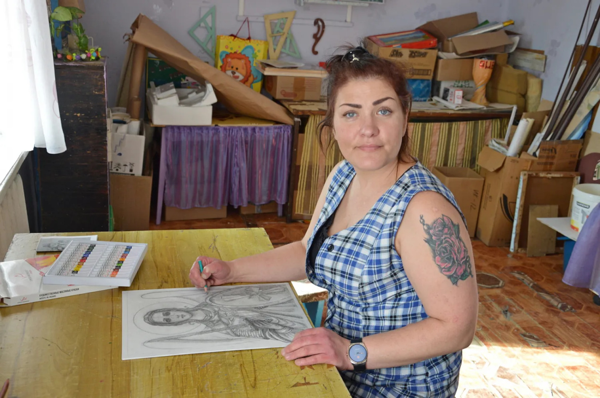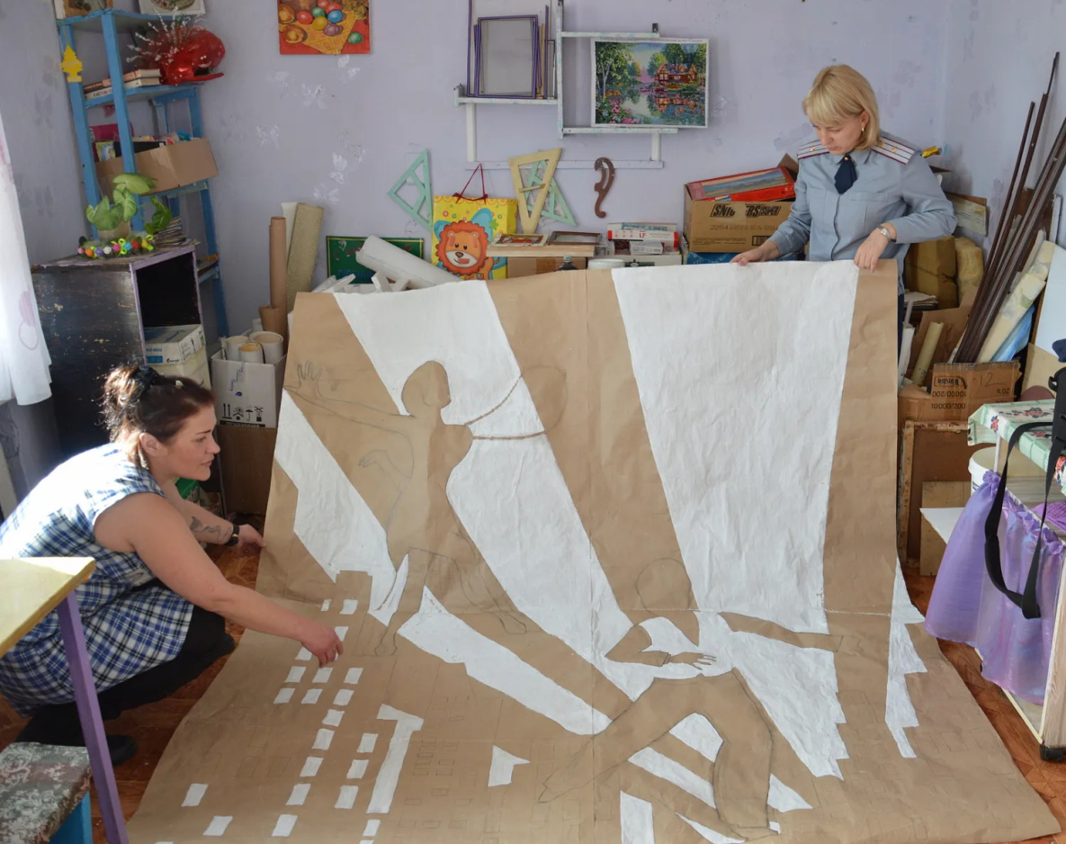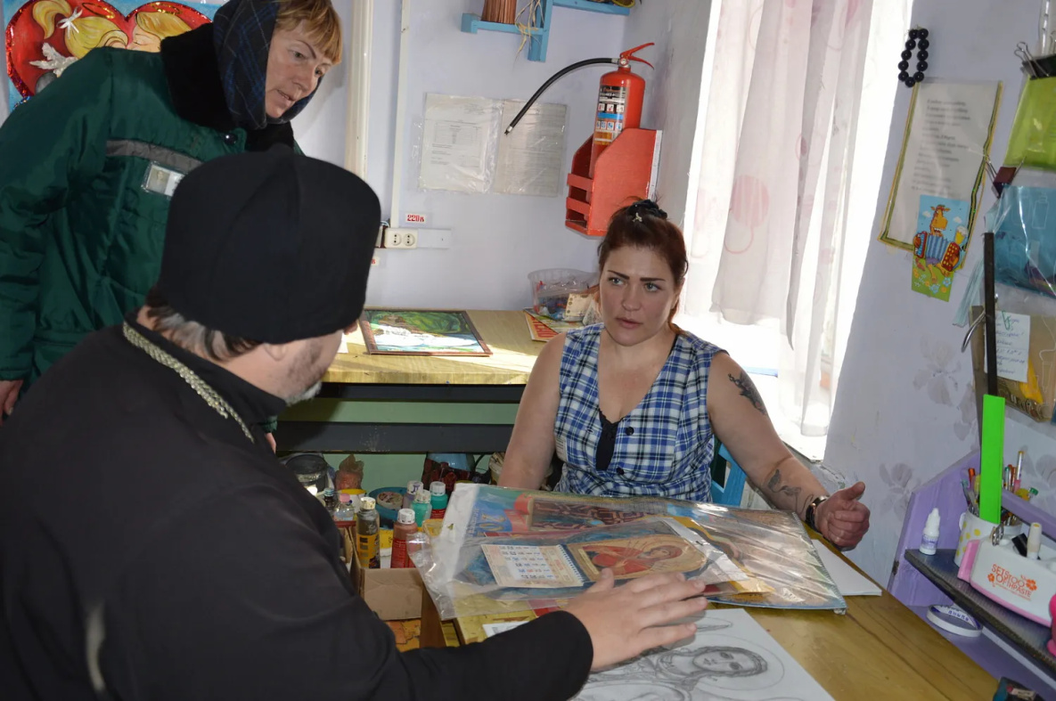 Икону она решила писать из интереса: по ее словам, никогда ни над чем подобным работать не приходилось. Хотя рисует она постоянно, как штатный художник колонии отвечает за все декорации и оформительские работы. Шесть дней в неделю приходит к 10 утра в мастерскую и с перерывом на обед до 19 часов делает таблички для кабинетов, рисует на обычной упаковочной бумаге декорации для спектаклей и постановок, плакаты к праздникам. В свободное время по фотографиям пишет портреты детей и внуков для других осужденных. А если еще остается минутка – то и открытки для 6-летнего сына, который сейчас живет с бабушкой.