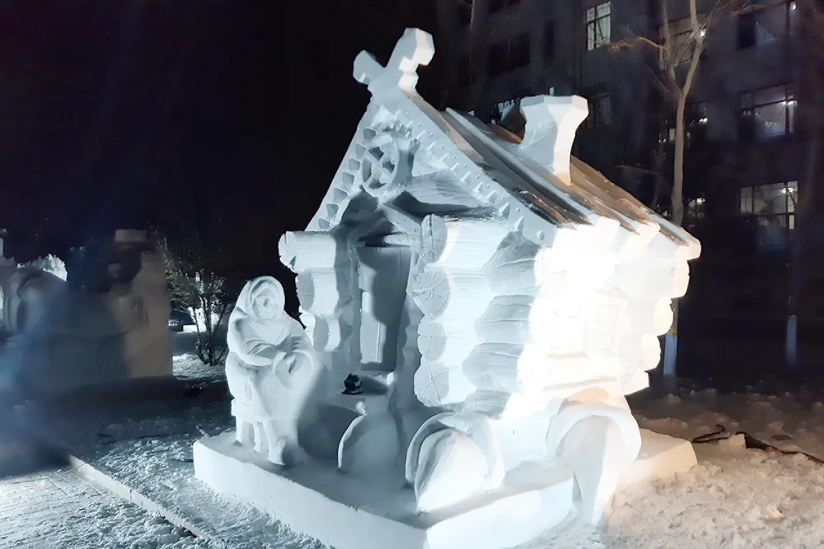 Подготовка к конкурсу началась еще за 2,5-3 месяца до его начала. Ежедневные задачи студенты отрабатывали с преподавателями кафедры: рисовали эскиз, работали над макетом, прорабатывая малейшие детали на пластилине, чтобы затем без перенести задуманное на трехметровый снежный куб. В этом году тематика была сказочная, поэтому решено было сделать композицию «Избушка Бабы-Яги».