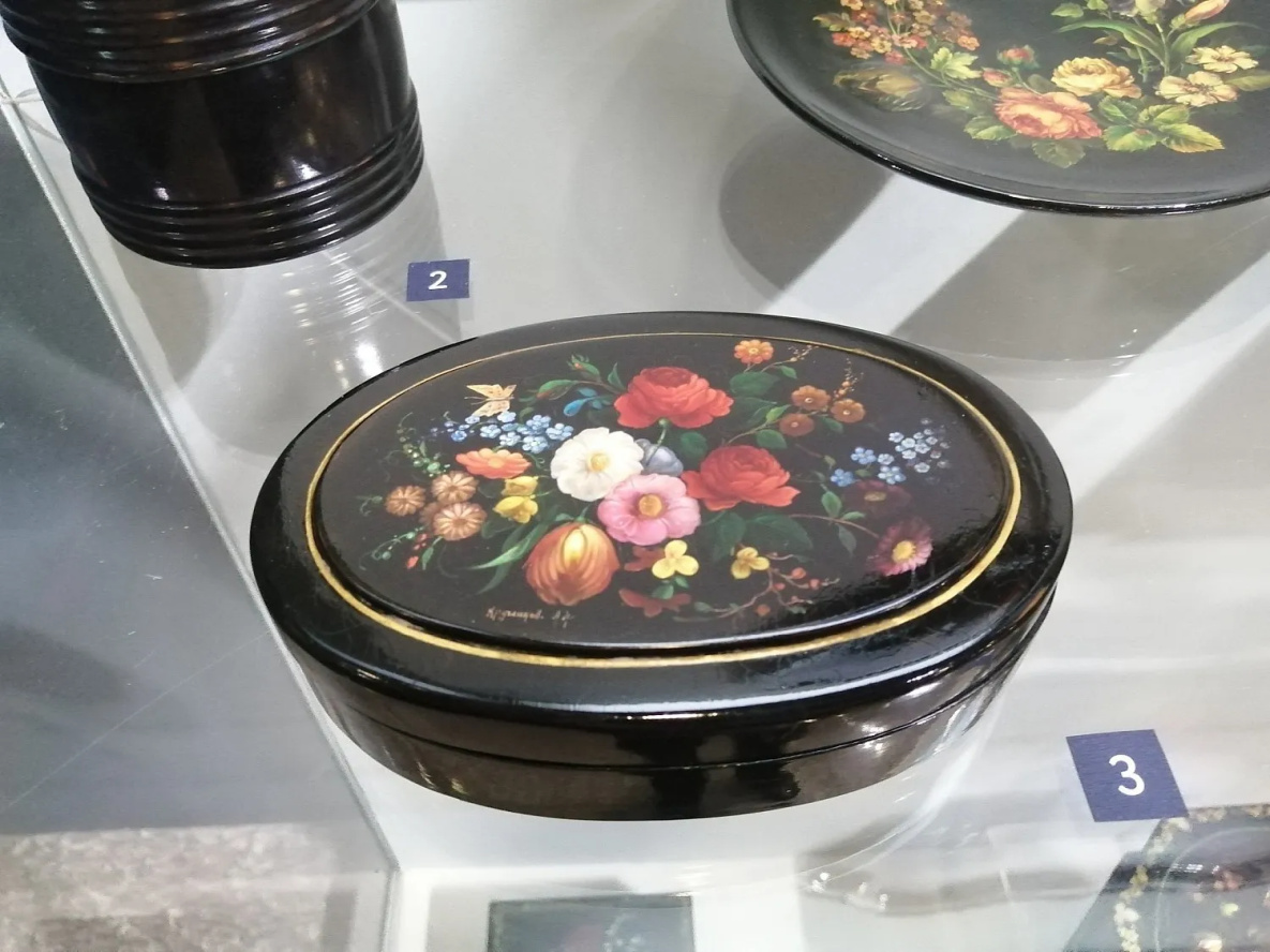Посетители могут полюбоваться лаковой миниатюрой Мстеры и Федоскино. Лучшие работы тончайшей росписи! Увидеть ростовскую финифть и ажурную металлическую скань. Отдельная витрина – сказки. Ведь столько сказок написано о цветке!