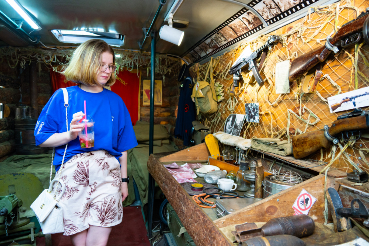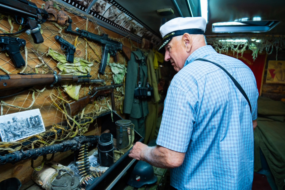 Во время остановок в населенных пунктах работала уникальная выставка, которая развернулась прямо в салоне автобуса. Это и различные виды оружия, обмундирования, ордена, артефакты с мест боев, архивные документы. На стенах висели плакаты и фотографии военных лет. Помимо основной экспозиции, для посетителей также подготовили презентацию масштабного военно-исторического фестиваля