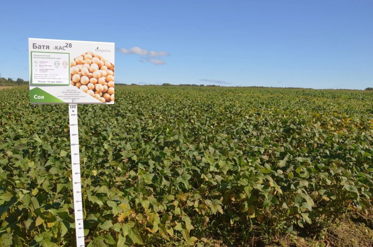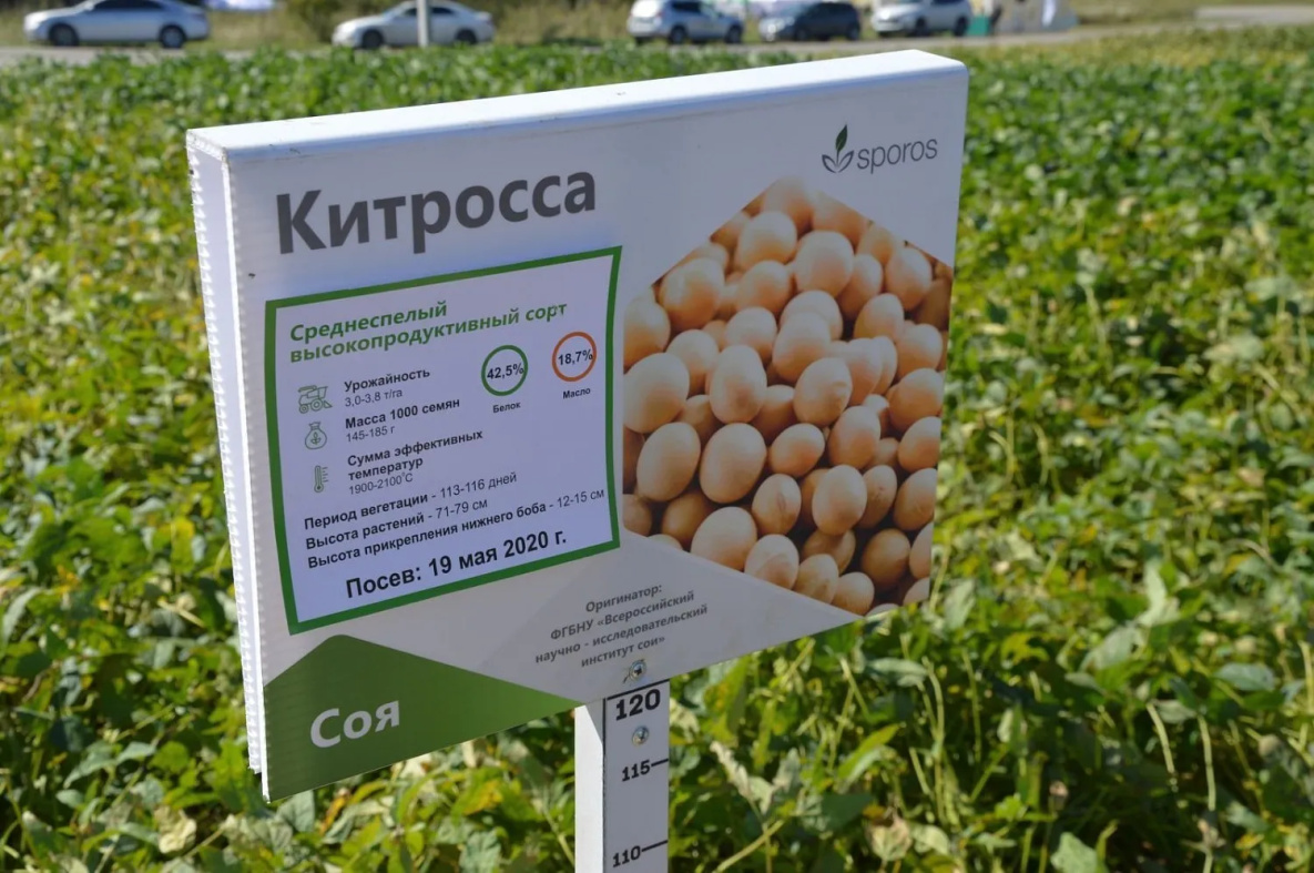 Помимо известного аграриям Дальнего Востока сорта сои «Батя», фирма «Спорос» представила на своей опытной производственной площадке у села Ровное Хабаровского района четыре новых экспериментальных версии этой культуры. Они выведены в Благовещенске Амурской области, в научно-исследовательском институте сои и названы «Китросса», «Куханна», «Кружевница» и «Лебёдушка».