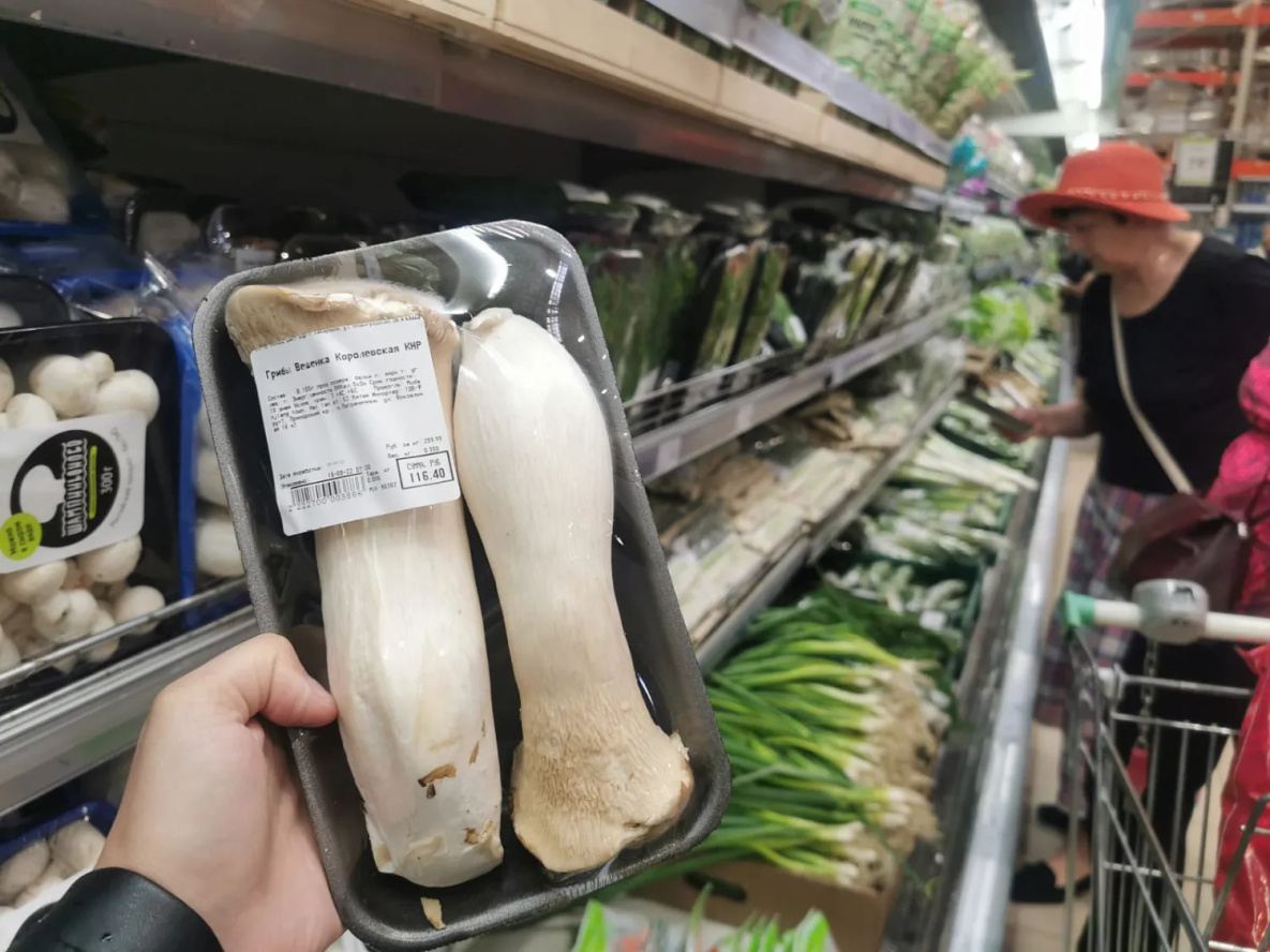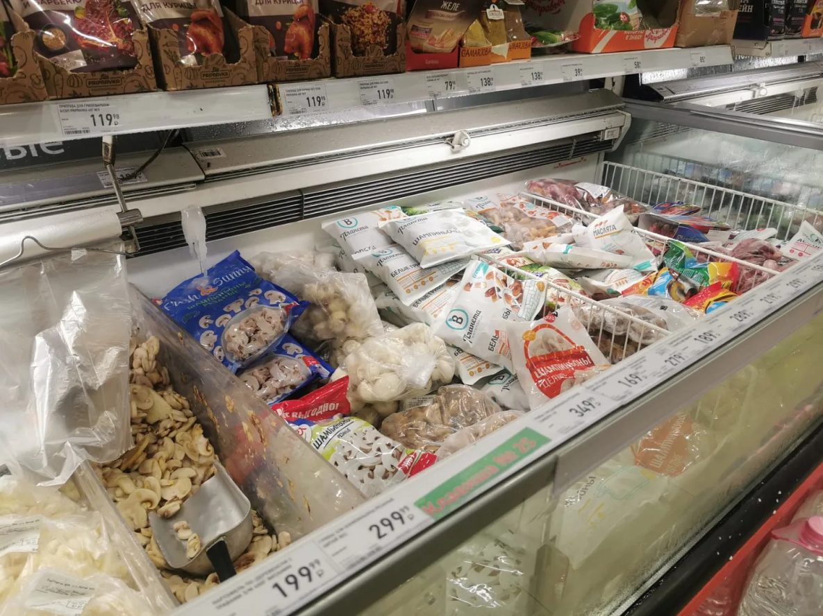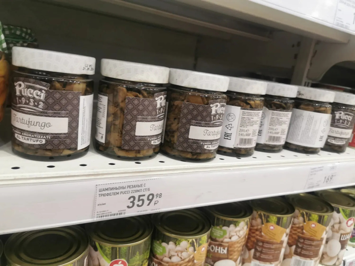 Разбегаются глаза от привезенных из других регионов маринованных яств. Цены, в зависимости от производителя, меняются. Опята маринованные стоят около - 540 руб/л, шампиньоны - от 490 руб/л. Причем консервированные шампиньоны в жестяных банках доступнее - 164-258 руб/л, а резанные можно найти и за 94 руб/л. Есть и свои изюминки – резанные шампиньоны с трюфелем – 1 600 руб/л. В магазине целое царство замороженных грибов. Белые – около 1 тыс руб/кг, шампиньоны от 350-400 руб/кг, маслята – 800 руб/кг.