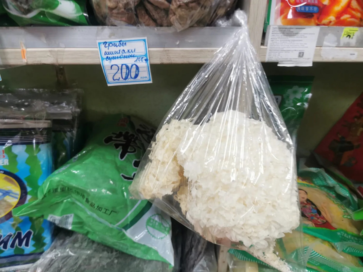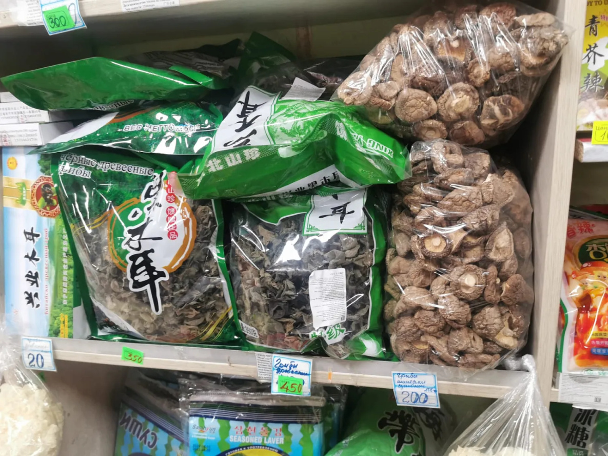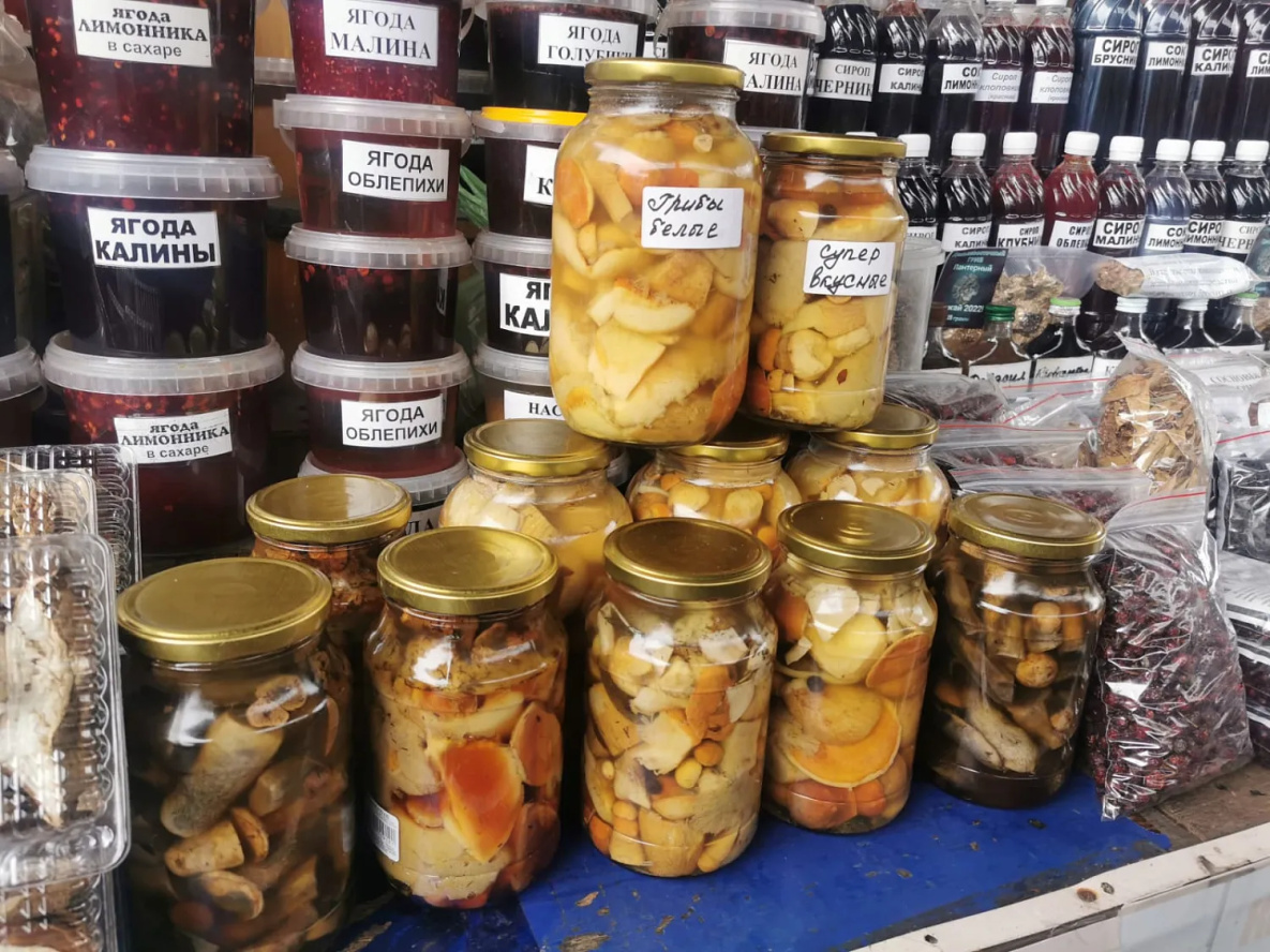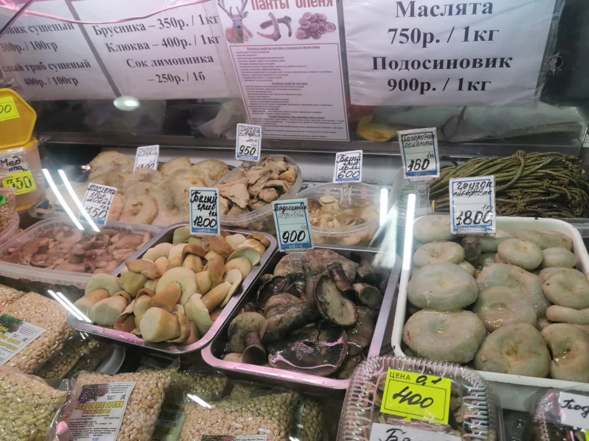Сушеные грибы в коробочках (белые и подосиновики) – 300-500 рублей за 100 грамм. Но удалось найти на рынке и варианты намного доступнее - ведерко (1,6 кг) белых и подосиновиков за 1,2 тыс рублей. Здесь же можно взять домашние подосиновики, замаринованные с солью или соевым соусом, за 1 тыс руб/л.