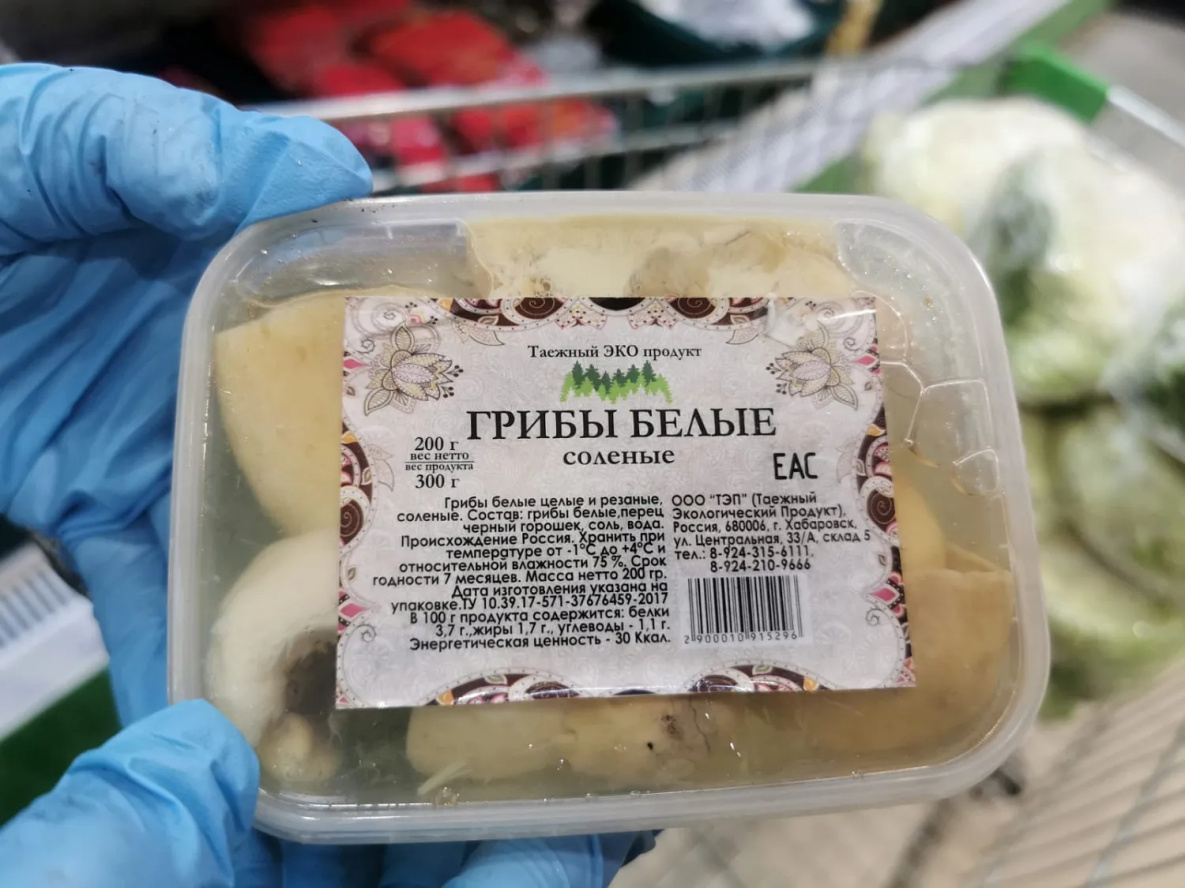 Отдельный стеллаж в продуктовом гипермаркете выделили под соленые грибы хабаровского производства. Белые отдают от 1,3 тыс руб/кг, рыжики – от 1,7 тыс руб/кг, рядовку - 1,1 тыс руб/кг, вешенки и шиитаке - 680 руб/кг.