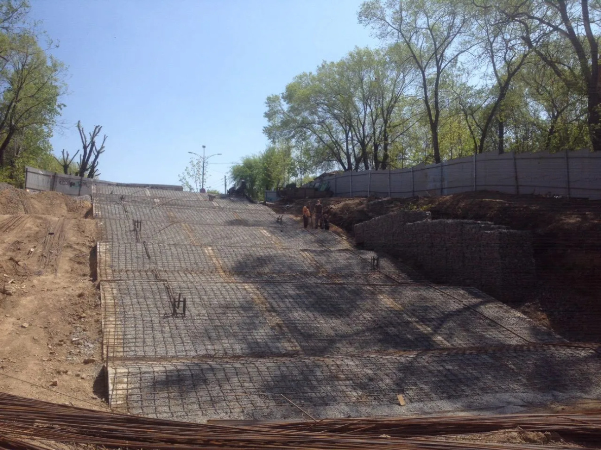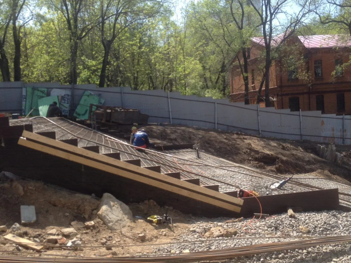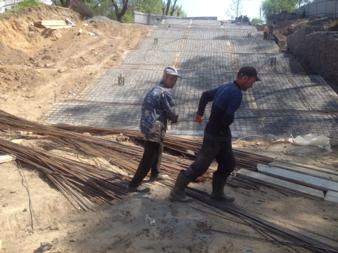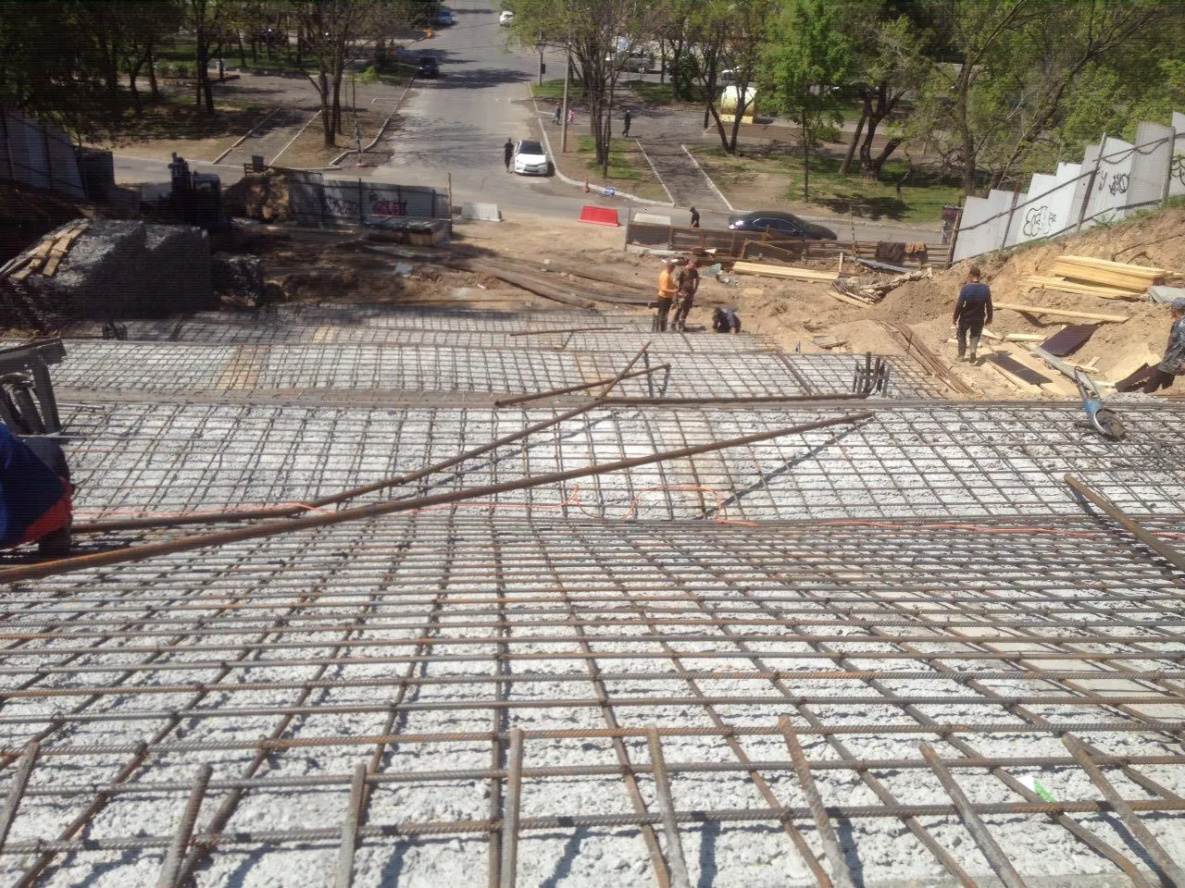На сегодняшний день на объекте трудится около десятка человек. Помимо строителей, производящих бетонирование основы будущей лестницы, за стройкой наблюдают еще и 2 геодезиста.