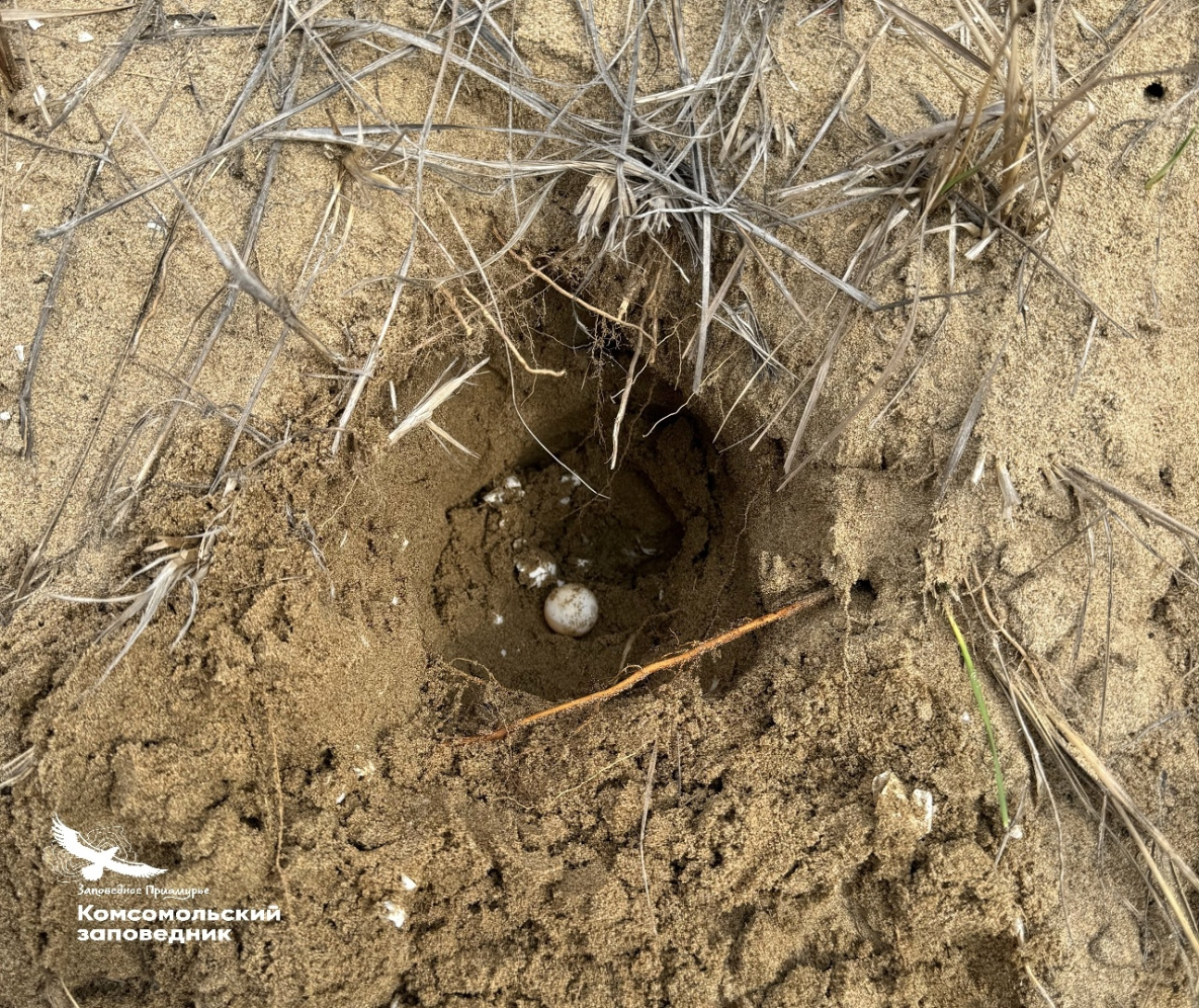 Еще летом, в конце июня, герпетолог обнаружил две кладки яиц черепахи, находились они в самой северной точки обитания, на острове Нижний Кеори. И уже при обследовании кладок в сентябре обнаружилось, что одну из них разорила норка.