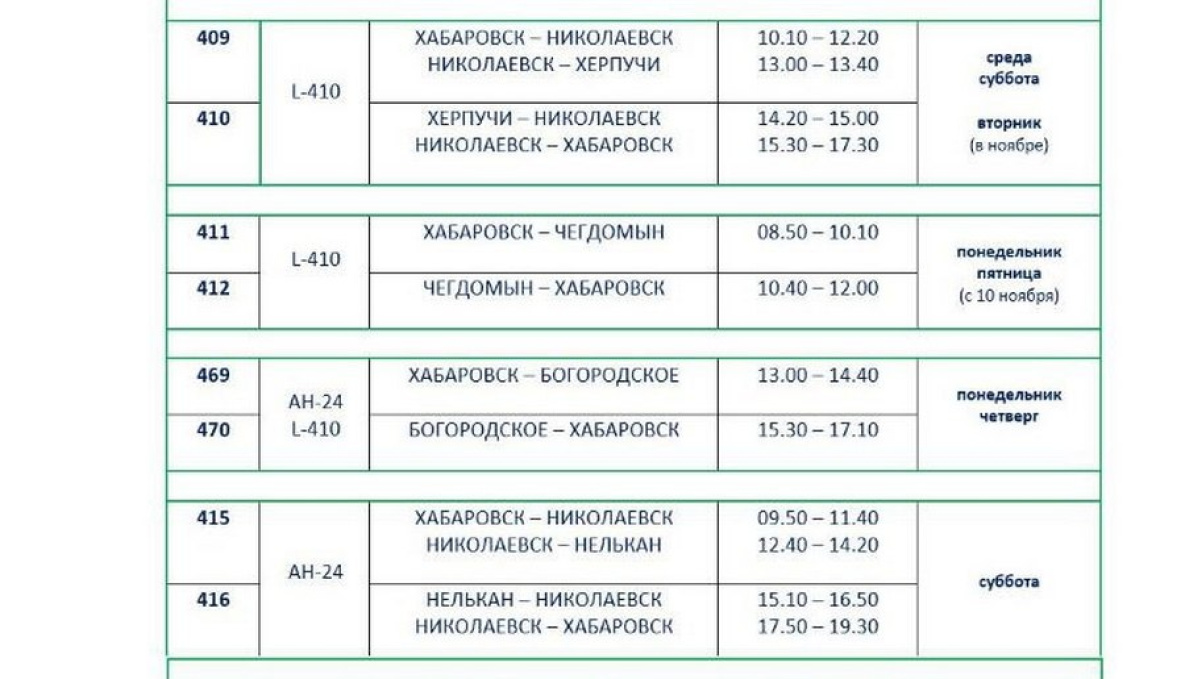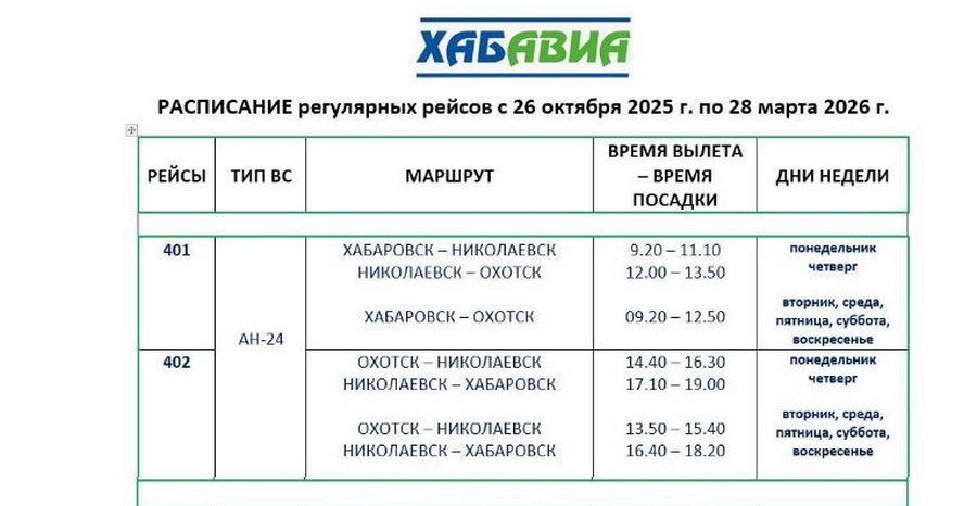 ХабАвиа с 26 октября 2025-го по 28 марта 2026 года меняет расписание рейсов. В этот промежуток самолеты в Аян будут летать три раза в неделю, в Чумикан – по будням ежедневно.