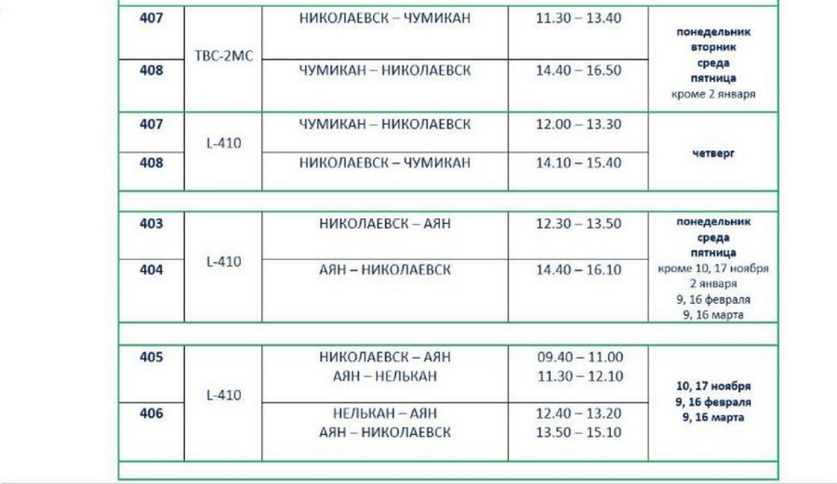 Из-за снижения пассажиропотока в зимний период полёты в Нелькан будут выполнять один раз в неделю – по субботам.