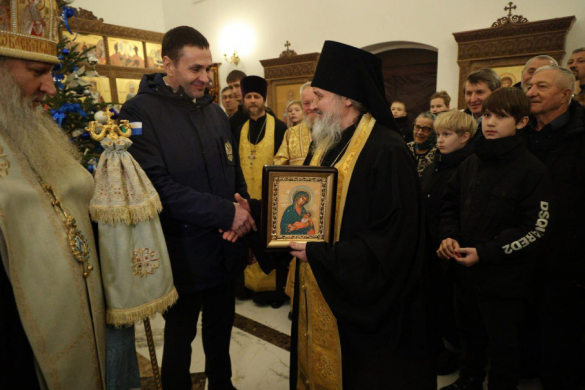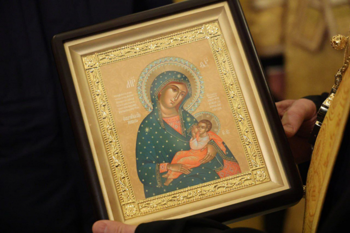 В честь знакового события губернатор Хабаровского края сделал приходу святой великомученицы Екатерины памятный подарок — икону Божией Матери «Блаженное Чрево – Хабаровская».