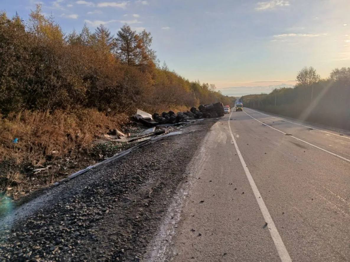 ДТП произошло накануне, 14 октября, на 528 км трассы «Хабаровск-Лидога-Ванино» недалеко от Ванино. Большегруз Freightliner ехал по обочине дороги, в результате не удержался на ней и съехал в кювет.