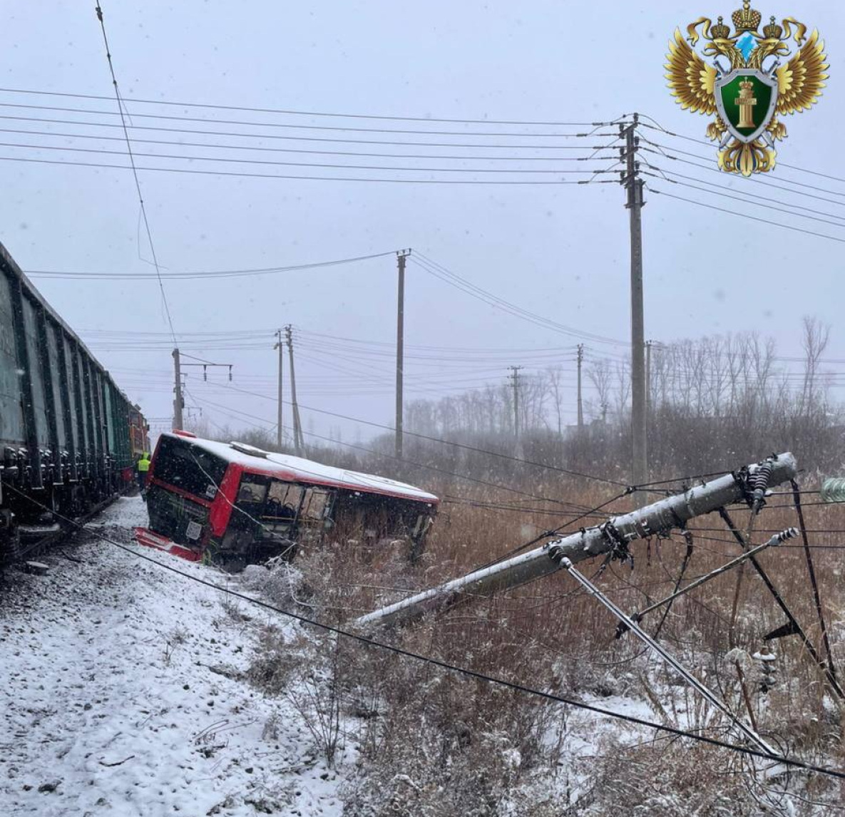 Напомним, сегодня в 12:44 на железнодорожном переезде в районе Кола Бельды 4/3 автобус выехал на пути на запрещающий сигнал семафора и столкнулся с грузовым поездом. Локомотив подавал вагоны с углем на ТЭЦ-3 на пути необщего пользования. Автобус пересекал пути перед поездом, машинист применил экстренное торможение, но столкновение все же произошло, и автобус упал в кювет.