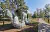 Пока фигура дракона еще не предстала во всей красе перед горожанами - она замотана в полиэтилен. Кстати, объект всё-таки претерпел изменения, в сравнении с первоначальными задумками: красный цвет, который должен был олицетворять советско-китайские отношения, заменили на нейтральный и гармонично вписывающийся в экологическое убранство парка – зеленый.