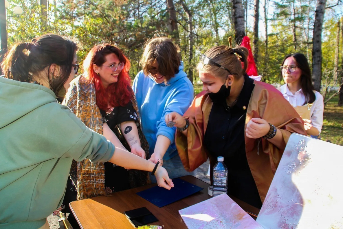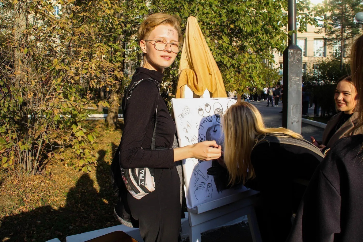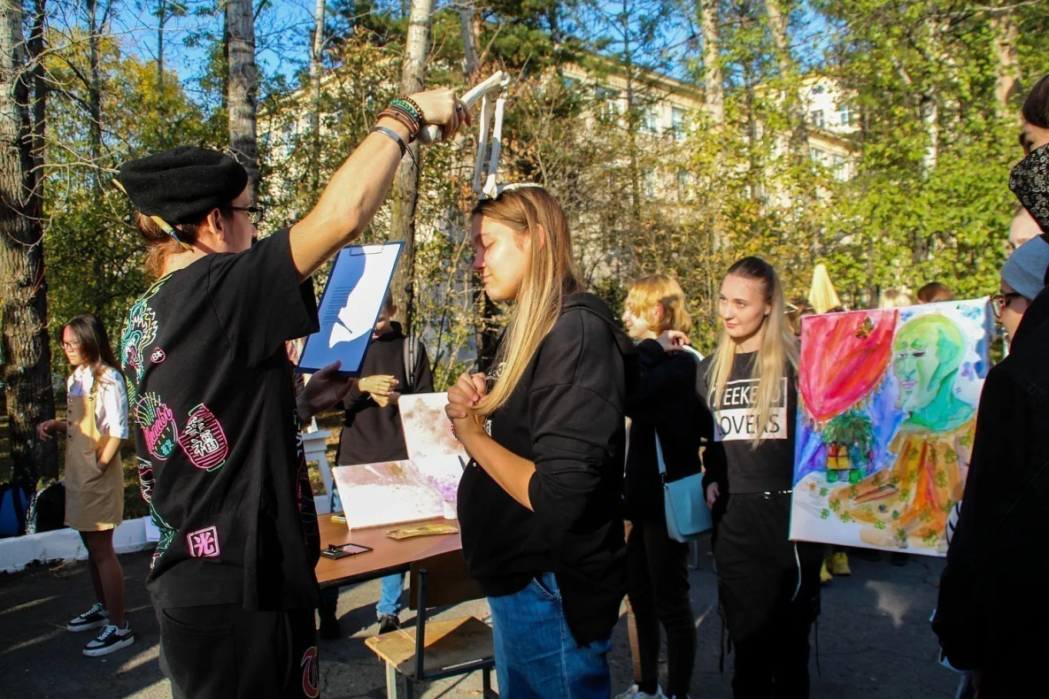 - Уже с 1 сентября ощущаю себя студентом! Рада, что у нас есть такой праздник, атмосфера крутая: сегодня группой рисовали натюрморт, чтобы не было скучно, решили сделать оригинальную работу: тут и герой мультфильма Сквидвард, и кубик Рубика, и бабочка, - говорит студентка первого курса Факультете искусств, рекламы и дизайна Педагогического института ТОГУ Ирина Рощина. - Я поступила сюда, потому что увлекаюсь дизайном и хочу им в дальнейшем заниматься, но также смогу в будущем попробовать себя в качестве преподавателя ИЗО.
