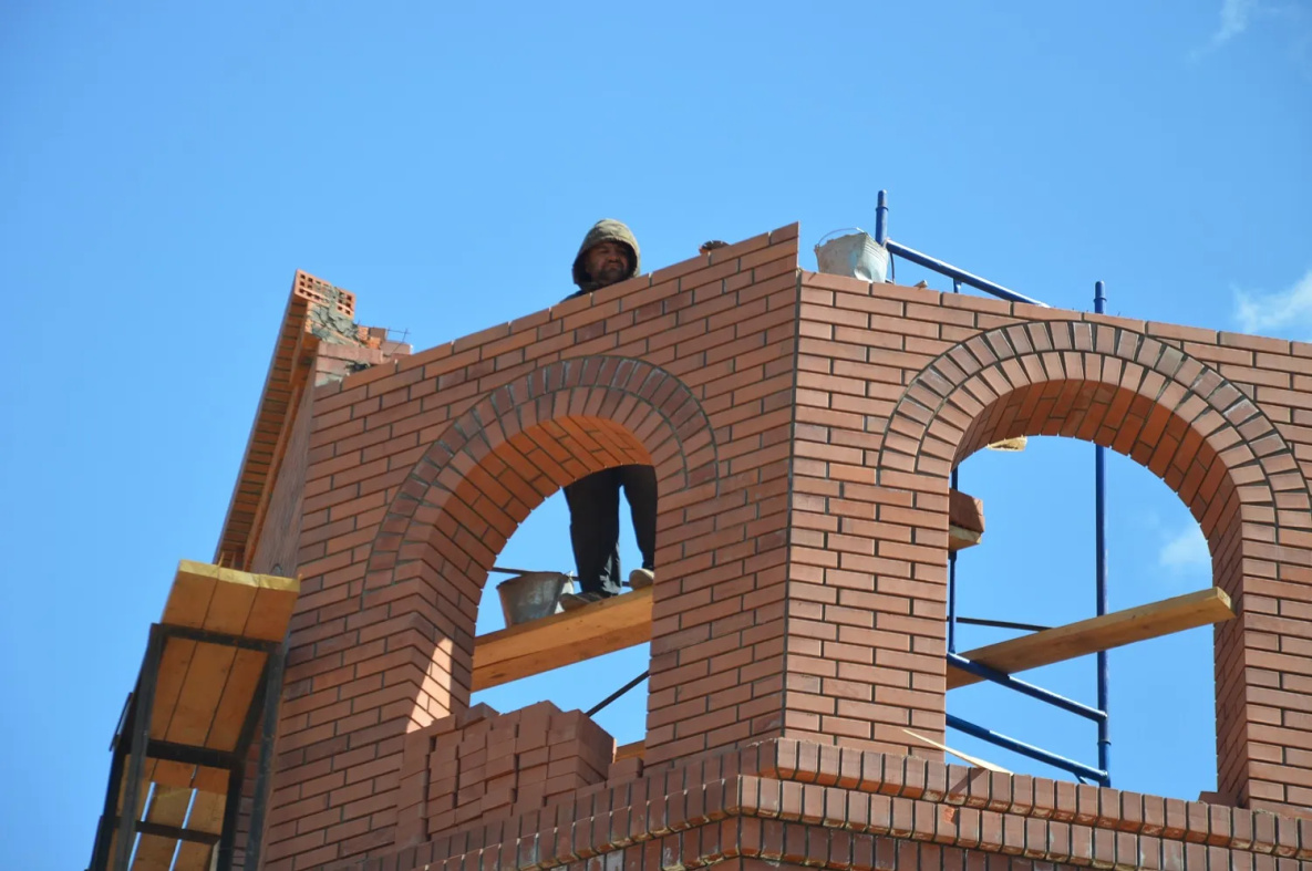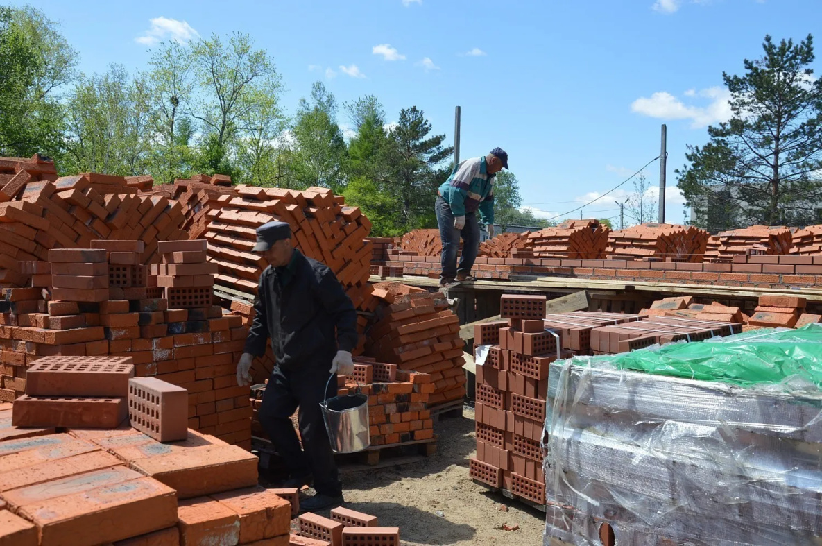 На залитом солнцем участке, огражденным высоким забором, идет размеренная работа. Ежедневно здесь трудятся порядка 15 человек. Разные бригады: бетонщики, электрики, монтажники, каменщики и другие.