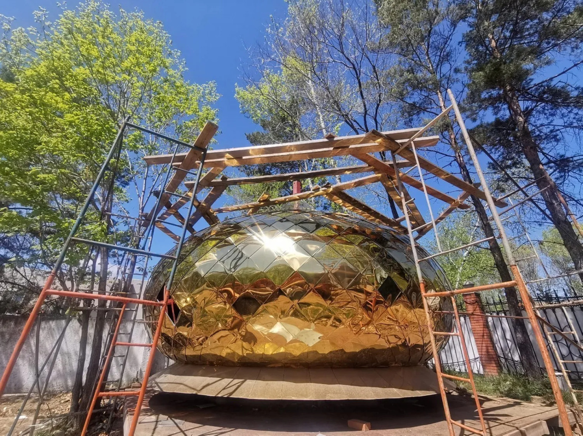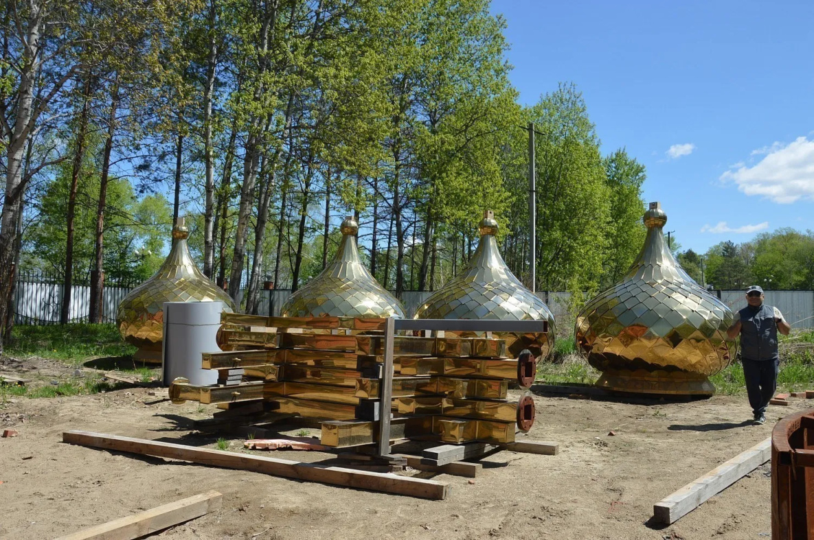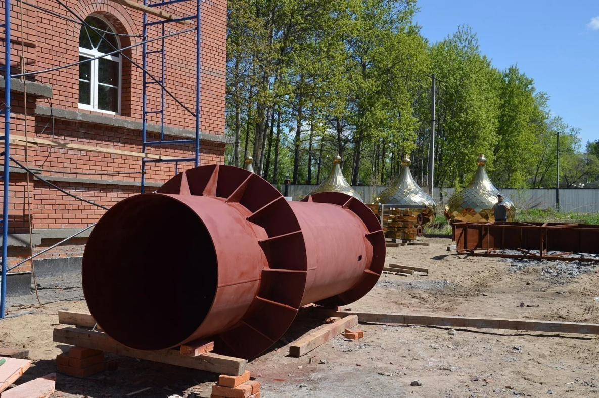 Планировка храма классическая, включает четыре зоны – алтарную, центральную, среднюю и притвор. Неподалеку на траве стоят приготовленные к монтажу шатер для будущей колокольни и позолоченные купола. Один - просто гигантский. Все эти маковки создавались на этом же участке, на это ушло практически 1,5 года. Михаил Десятников указал на металлические трубы, лежавшие поодаль. Это металлические конструкции, на которые будут установлены купола. В центре крыши здания уже сейчас заливается из монолитного бетона центральный барабан, на который установят главный купол. Высота этого основания будет больше семи метров.