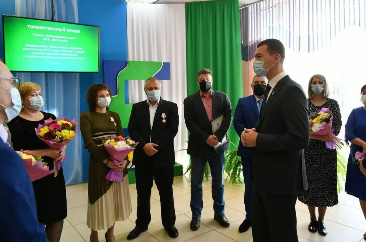 Врио губернатора Хабаровского края Михаил Дегтярёв сегодня во время поездки в район имени Лазо вручил работникам инфекционного отделения местной ЦРБ государственные, ведомственные и краевые награды за вклад в борьбу с распространением COVID-19. Глава региона поблагодарил медиков за их самоотверженный труд, отметил преданность профессии и оценил любовь к людям, сообщает ИА «Хабаровский край сегодня».