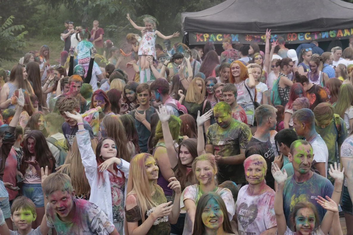 Раз в полчаса диджей собирал всех, кто пришел на праздник к сцене, люди вели обратный отсчет и устраивали настоящий взрыв красок подбрасывая цветной порошок в воздух.