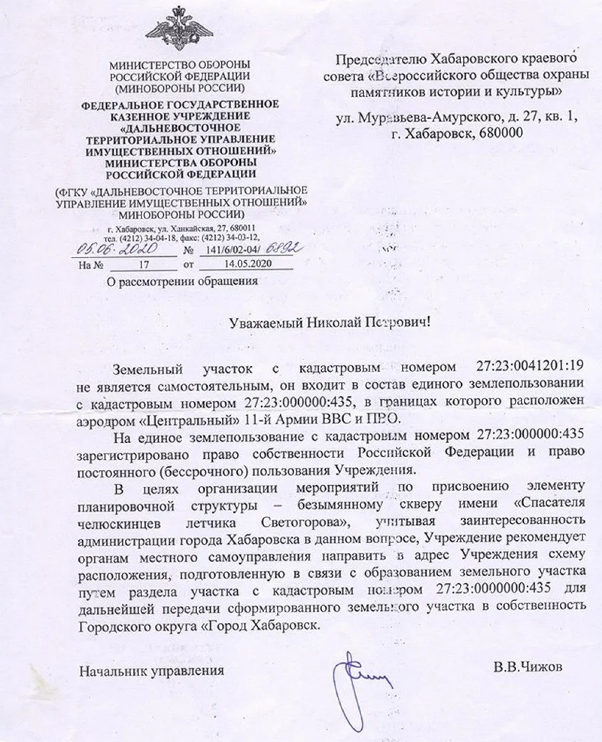 Людмила Ишаева. – Мы обратились в Минобороны с этим предложением и там нашли полную поддержку. Более того, как сообщили нам в письме Дальневосточного теруправления имущественных отношений МО РФ на имя председателя нашей организации Николая Крадина, военные готовы даже передать землю под сквер в собственность города, чтобы присвоить ему имя Светогорова.