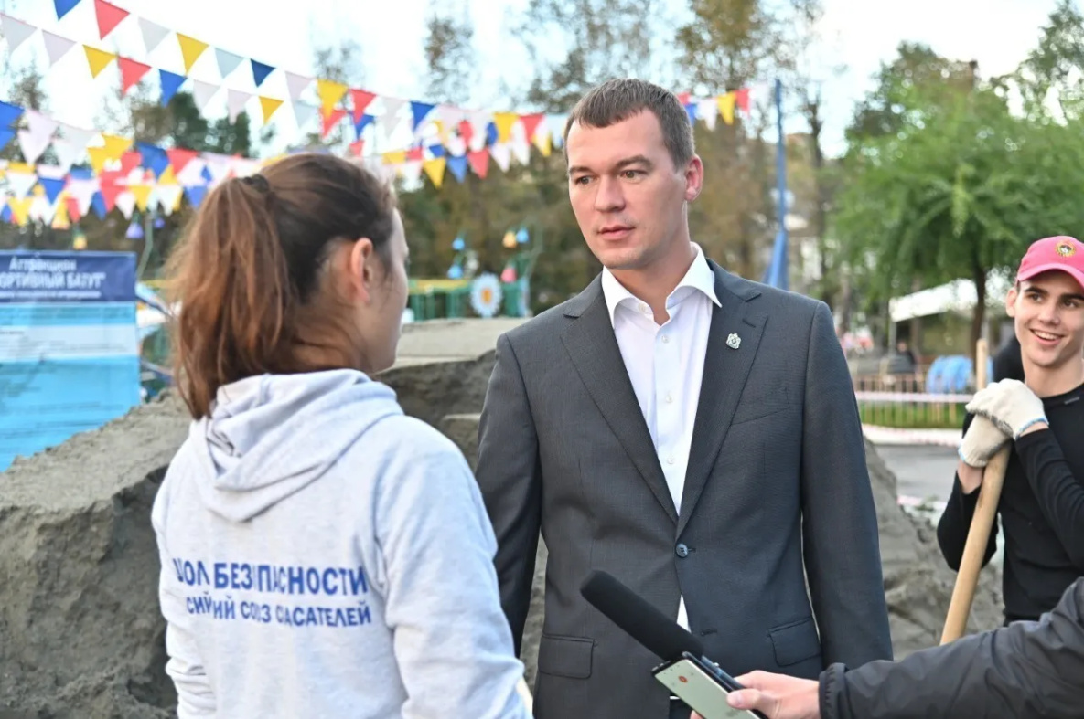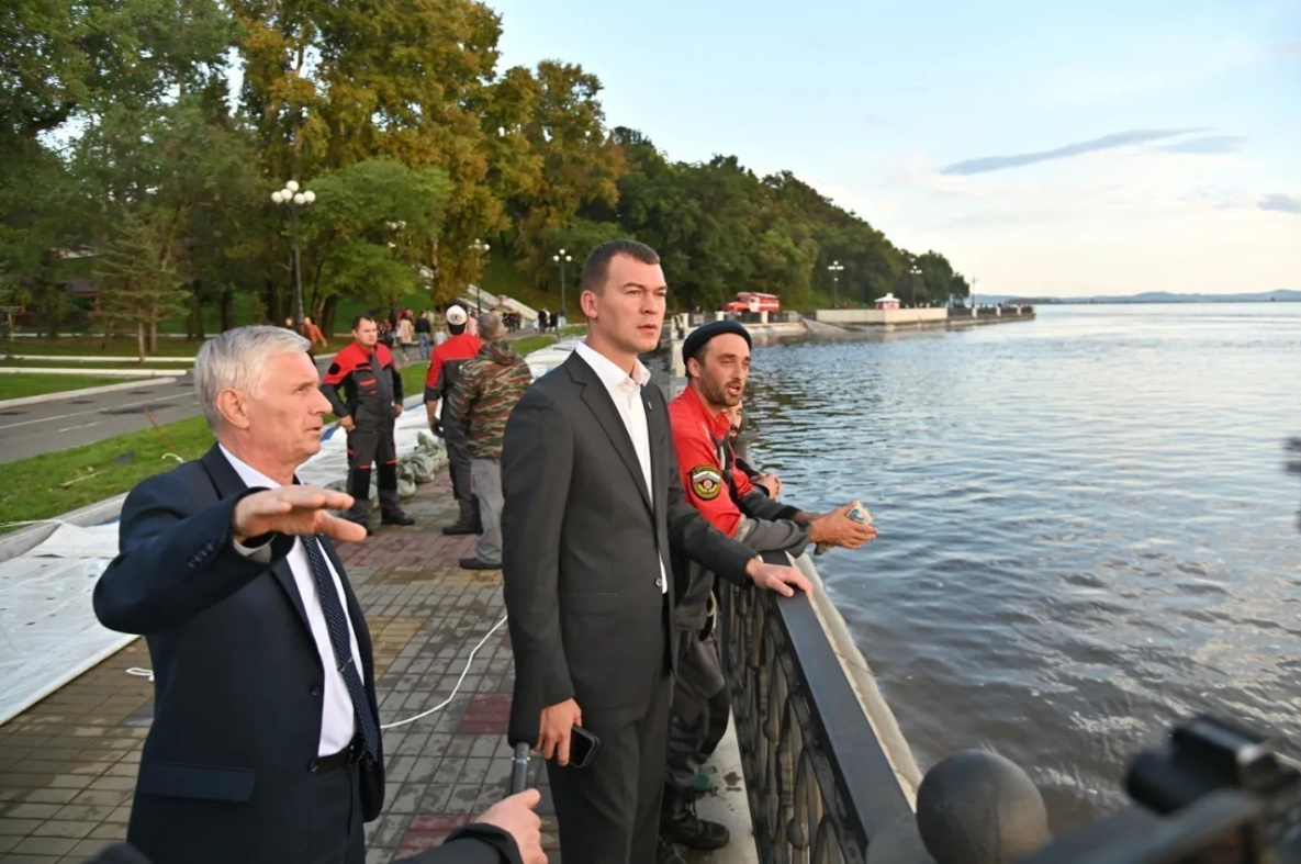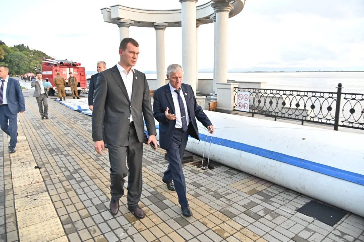 Временно исполняющий обязанности губернатора Хабаровского края Михаил Дегтярёв проверил ход работ по экстренному развёртыванию водоналивной дамбы на главной набережной краевой столицы.