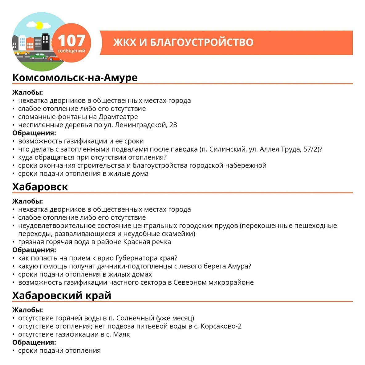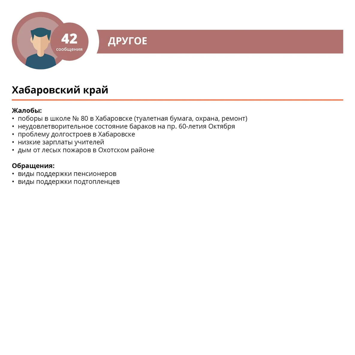 Дачники, чьи участки утонули во время паводка-2020, интересовались возможностью получить компенсации. Кроме того, поступил сигнал о поборах в школе №80 в Хабаровске на покупку туалетной бумаги, охрану и ремонт.