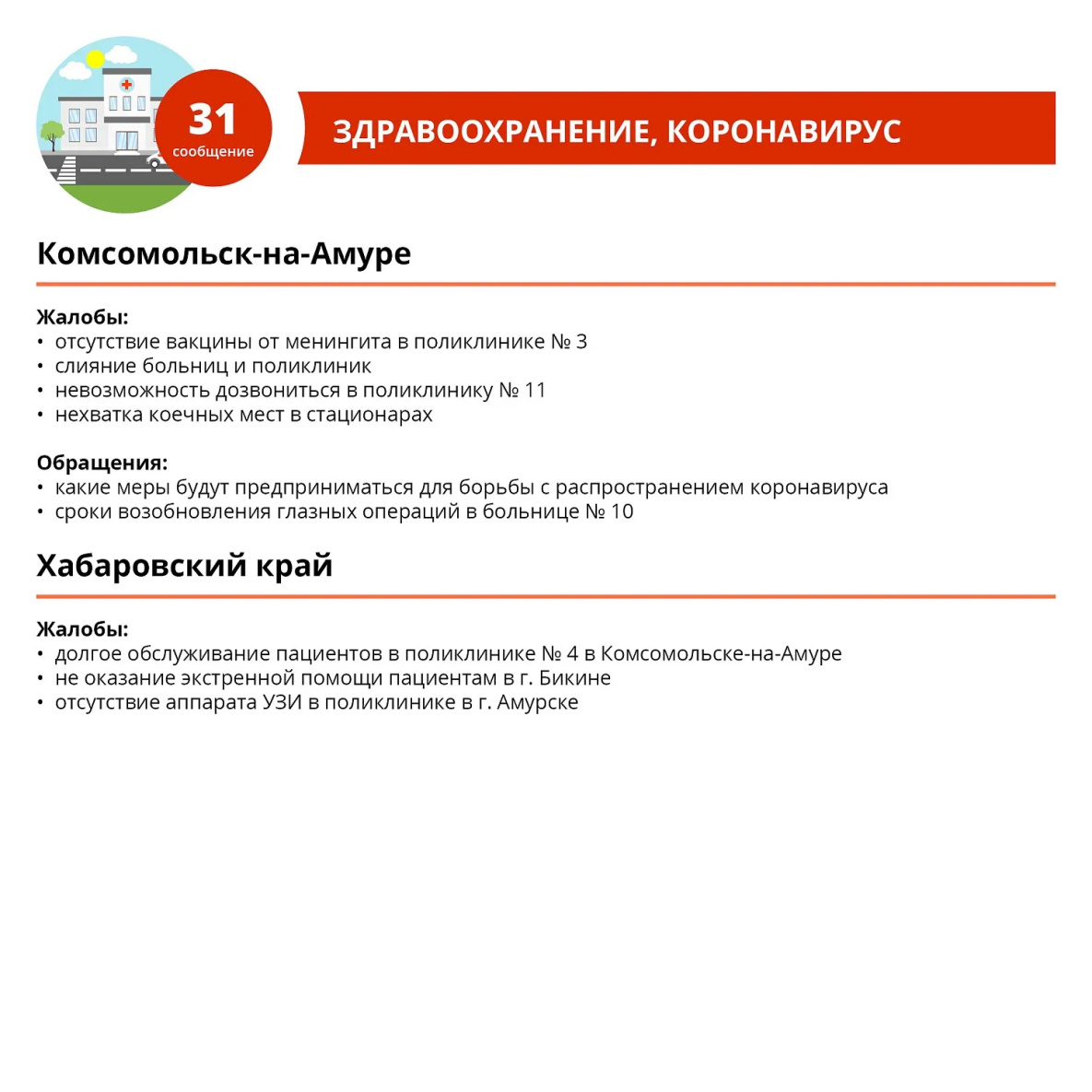 В сфере здравоохранения жителей региона волнует отсутствие вакцины от менингита в поликлинике № 3, долгое обслуживание пациентов в поликлинике № 4 в Комсомольске-на-Амуре, неоказание экстренной помощи пациентам в Бикине, отсутствие аппарата УЗИ в поликлинике в Амурске и так далее.