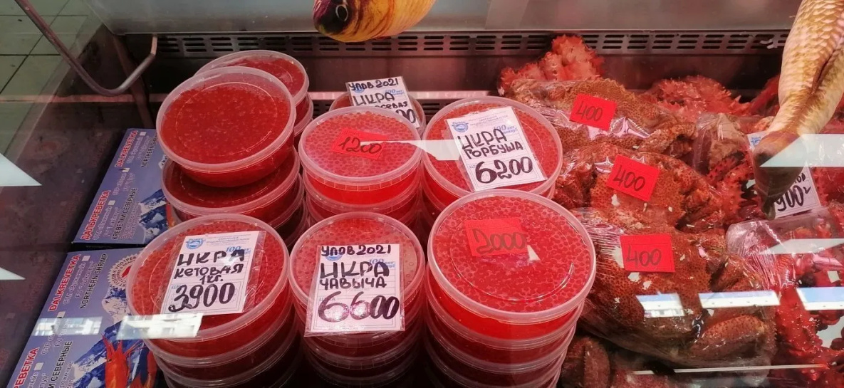 Красная икра. Самую дешевую удалось найти на оптово-розничной базе. Там за кило продукта предлагают от 3500 до 5000 рублей. За 3900 рублей икру можно приобрести на рыбном рынке. Разные виды этого полезного для дальневосточника продукта стоят по-своему: например, кило икры чавычи от 6600 рублей, горбуши - 6200. Чуть выше цены в сети специализированных магазинов морепродуктов. Правда в наличии в основном икра горбуши. Стоит она 4200 рублей за килограмм.