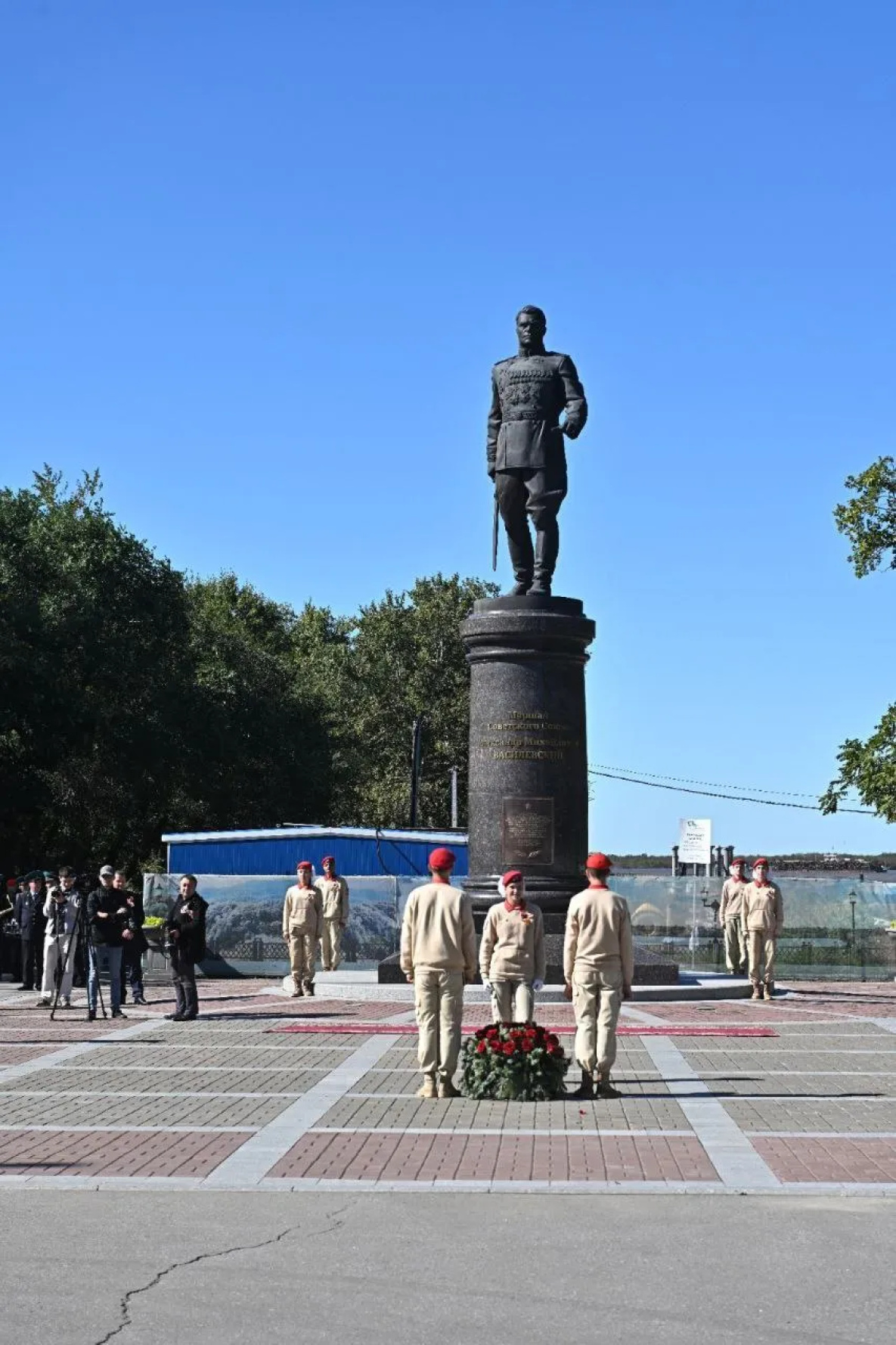 Мемориальная акция продолжилась у памятника Маршалу Советского Союза Александру Василевскому. Это он блестяще спланировал и провёл Маньчжурскую наступательную операцию, в результате которой войска первого и второго Дальневосточного, Забайкальского фронтов, Тихоокеанского флота и Краснознаменной Амурской флотилии разгромили миллионную Квантунскую армию. За это Василевского называют Маршалом дальневосточной победы.