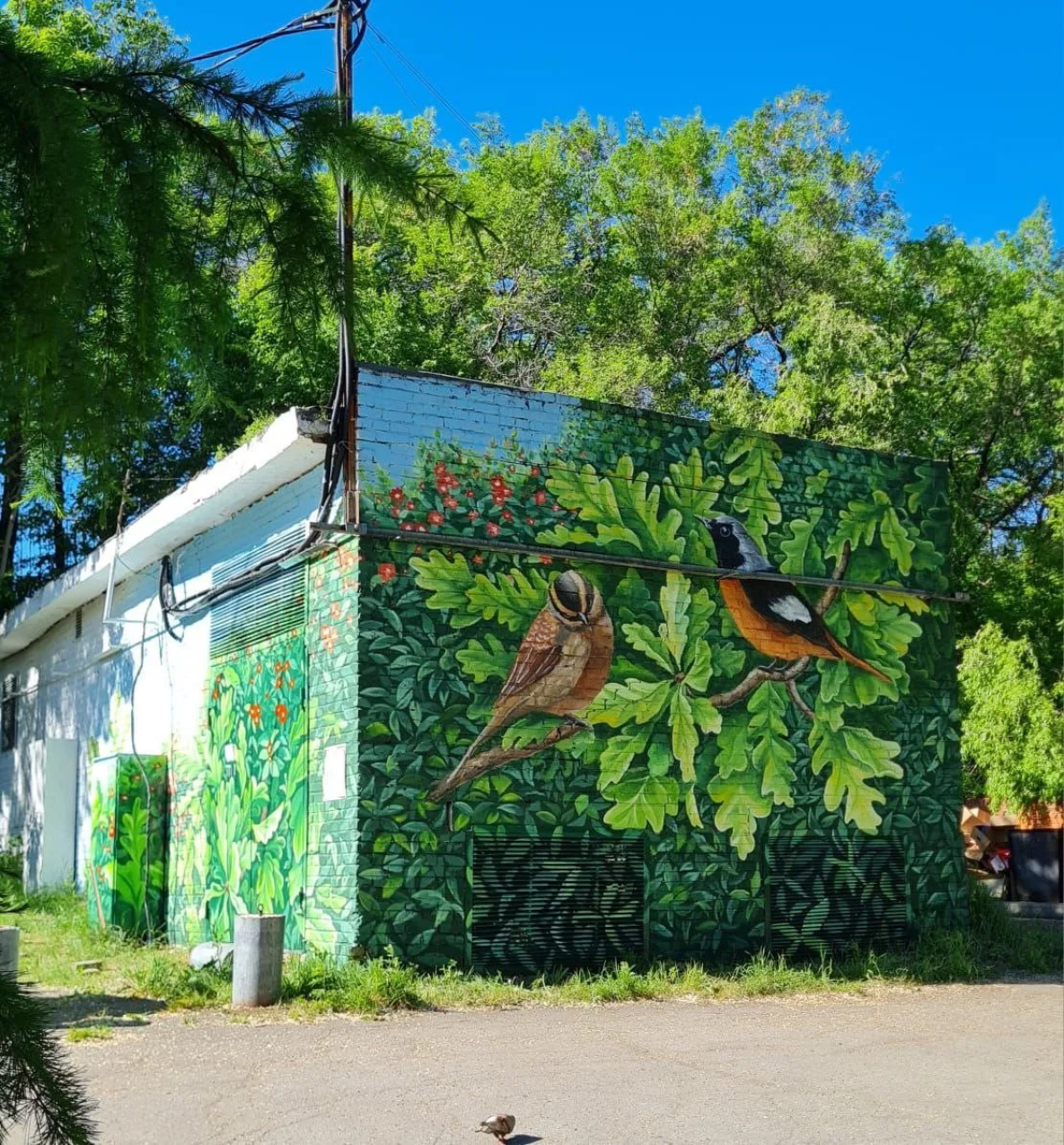 Кстати, именно краске Мария отдает предпочтение – нравится выводить кистями узоры, накладывать тени. Баллончики в своем творчестве использует редко. А еще девушка любит создавать арт-объекты таким образом, чтобы они буквально вписывались в общий колорит местности. Вот, скажем, замаскировала очередную стену трансформаторной подстанции на городских прудах и стоящие неподалеку мусорные контейнеры так, что складывается ощущение, будто кто-то просто масштабировал ветку сзади стоящего дерева, «навел фокус объектива» на притаившихся среди зеленой листвы пернатых обитателей.