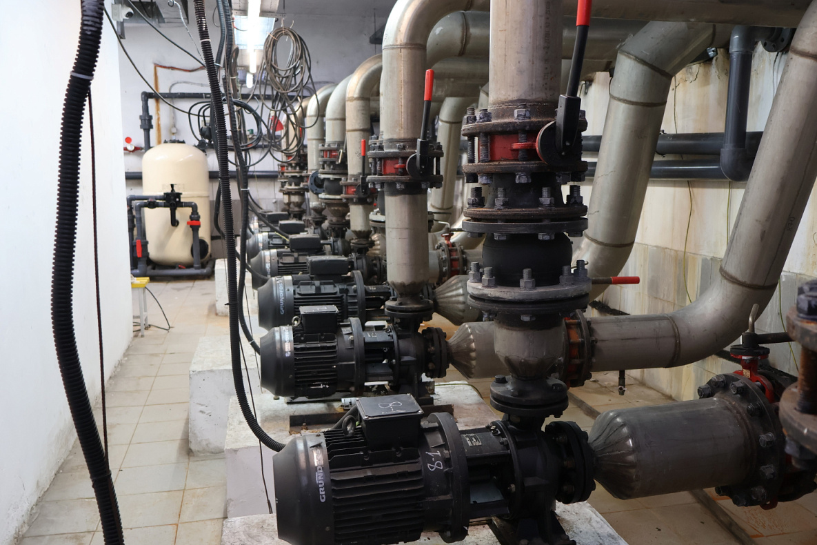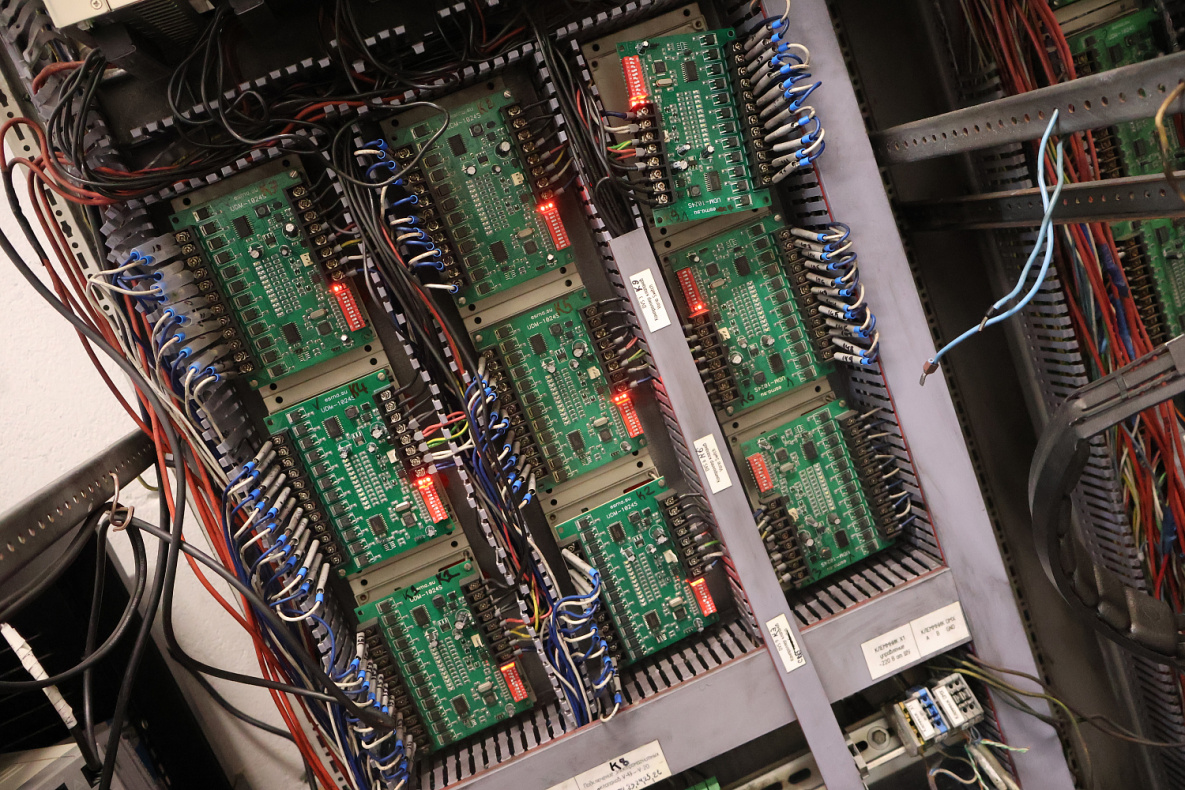 Спускаемся по железной лестнице на шесть метров под землю. Бетонная комната, в ней 12 шкафов, наполненных электроникой. Именно они обеспечивают автономную работу фонтана. То есть, человеческого вмешательства он не требует: сам «просыпается», отрабатывает заданную программу, и «засыпает». Система позволяет настроить высоту струй в зависимости от режима, синхронизирует их с музыкой, создает схему их движения. Ручная перезагрузка и установка параметров потребуется только после отключения электроэнергии.