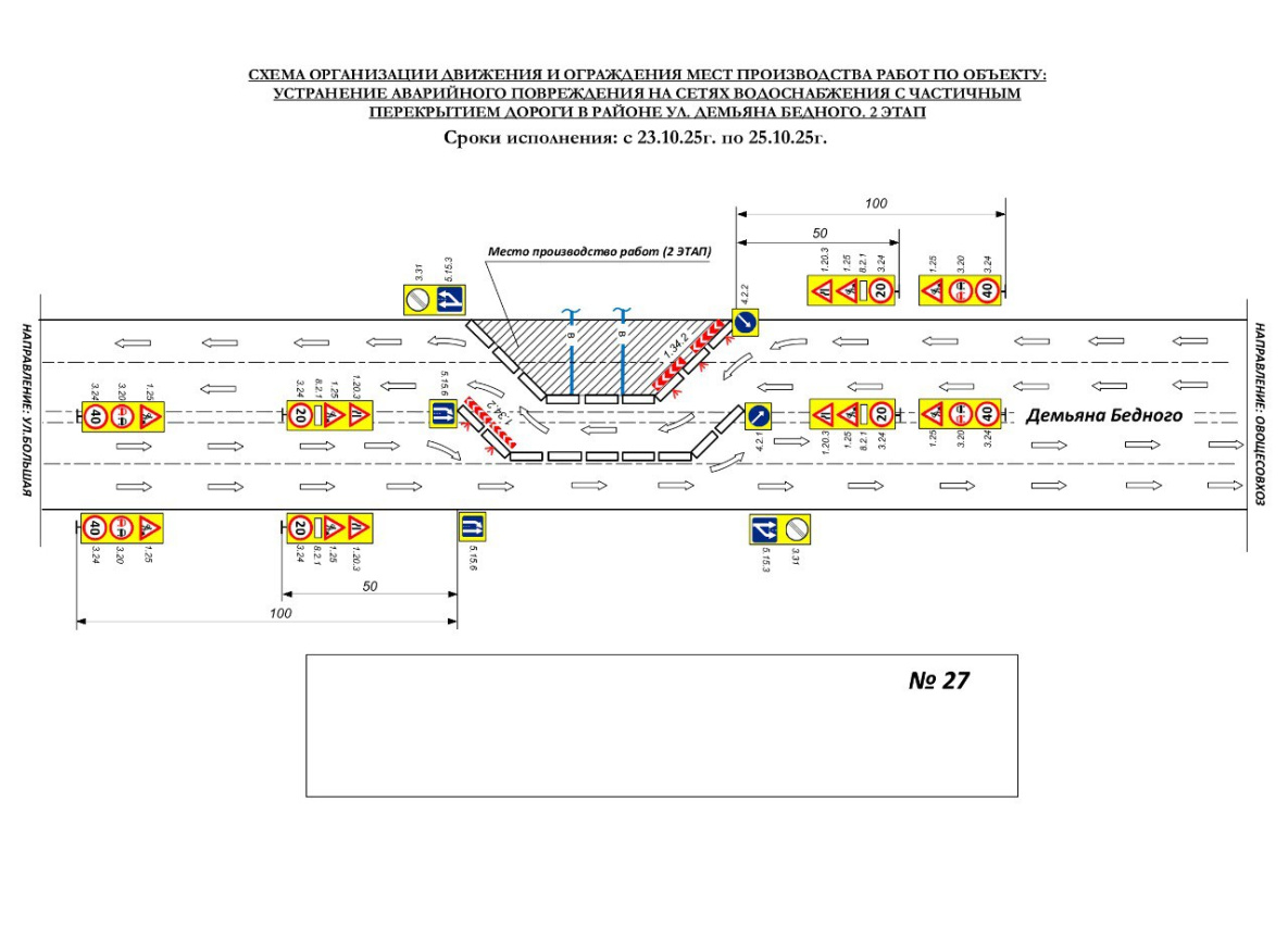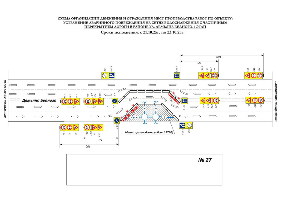 Ограничение дорожного движения запланировано с 21 по 25 октября. На участке дороги по ул. Демьяна Бедного в районе домов №№23 – 29 временно ширина дороги составит одну полосу на участке в десять метров.