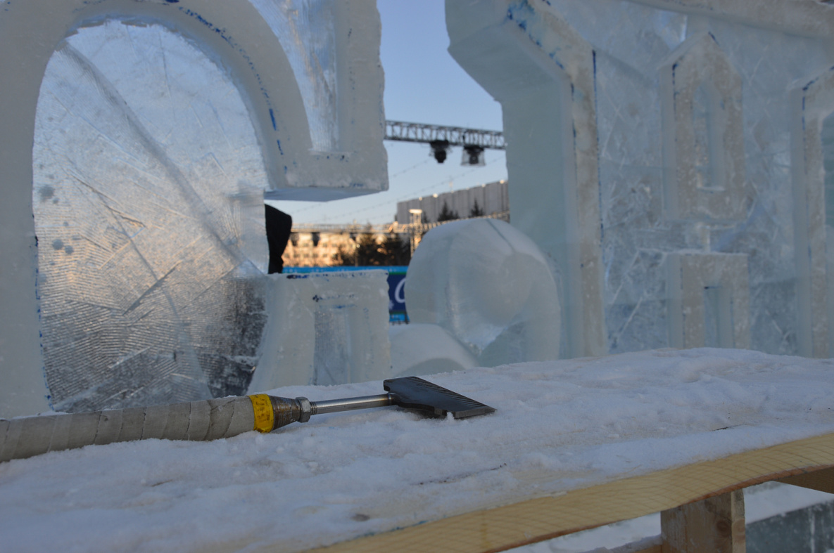 Самое главное при работе со льдом – острый инструмент, заточенный под правильным углом. Кстати, если в завезенной глыбе есть замерзший песок, он существенно тупит орудие. Именно поэтому, а также затем, чтобы ледовый блок отличался прозрачностью, его подготовке уделяется особенное внимание.