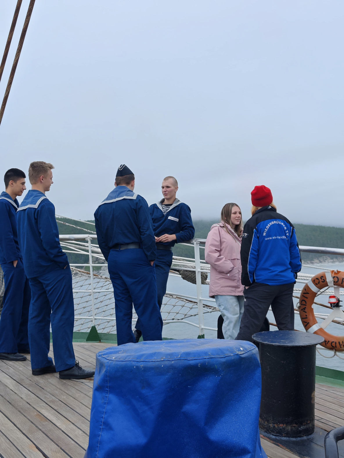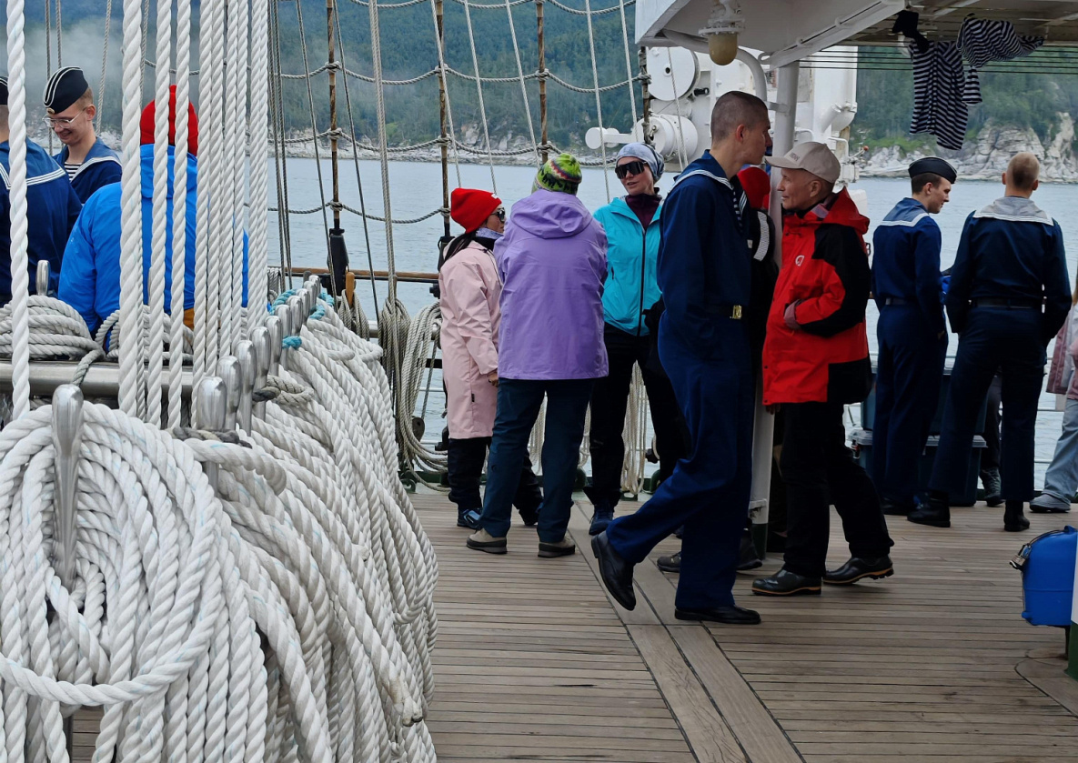 В свою очередь, на учебном судне провели захватывающие экскурсии по палубам фрегата для сотрудников и гостей туристической базы, где им поведали увлекательные рассказы о славной истории и о незабываемых кругосветных походах парусника.